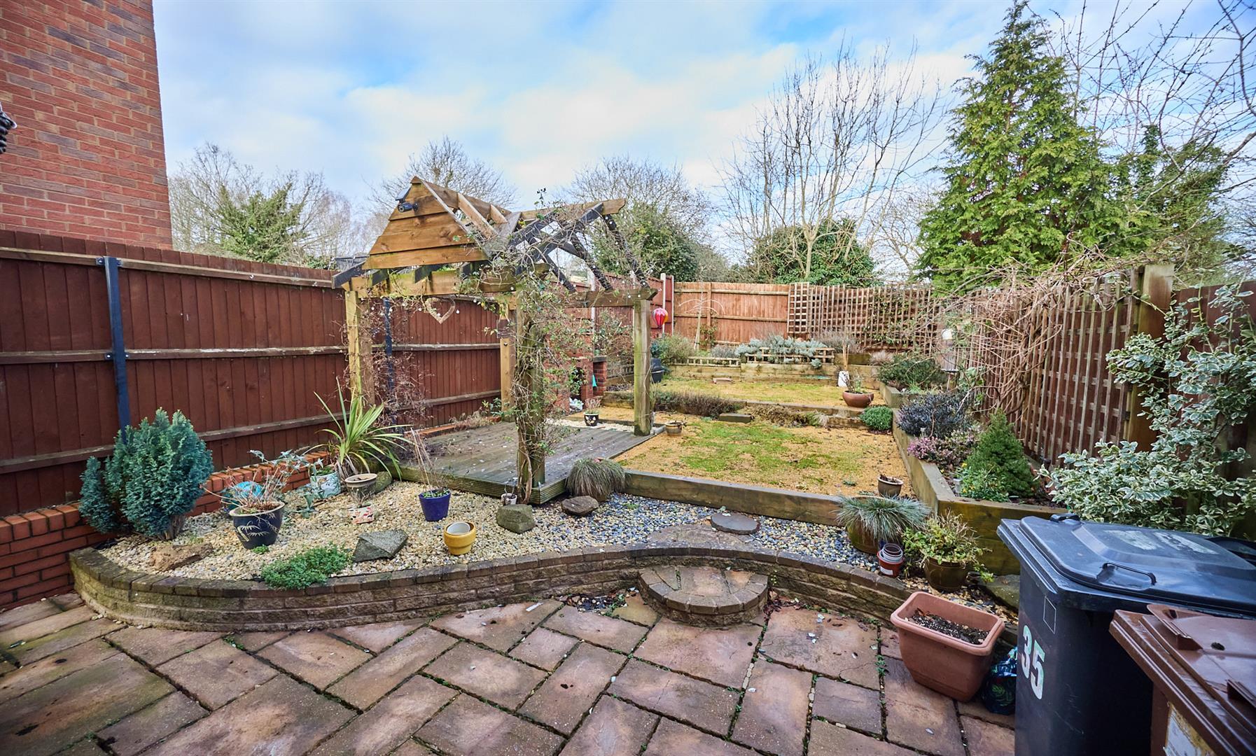 The property is nicely situated in a cul de sac set back from the road screened behind a mature hedge, the front garden is principally laid to laid with surrounding beds, a slab pathway and timber gate lead down the side of the property to a fully fenced enclosed rear garden which has been hard landscaped having a full width shaped flagstone patio adjacent to the rear of the property edged by low brick retaining wall. Beyond which is a timber decking patio and pergola, beyond which are railway sleepers and various areas of decorative stone and surrounding raised beds, brick built BBQ and further well stocked borders to the top of the garden, outside tap, power point and open aspect to the rear. Adjacent to the property is a block paved driveway leading to a brick built garage (2.49m x 5.31m) with up and over door to front, the garage has a pitched roof for further storage, timber racking and shelving.
