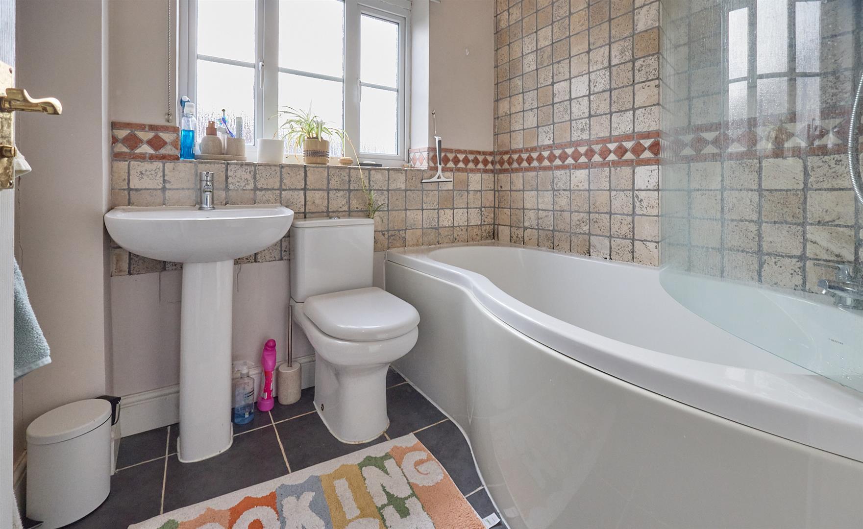 With white suite consisting of a P shaped panelled bath, main shower unit above, glazed shower screen to side, pedestal wash hand basin, low level WC, contrasting tiled surrounds including the flooring, chrome heated towel rail, shaver point, extractor fan and inset ceiling spotlights.