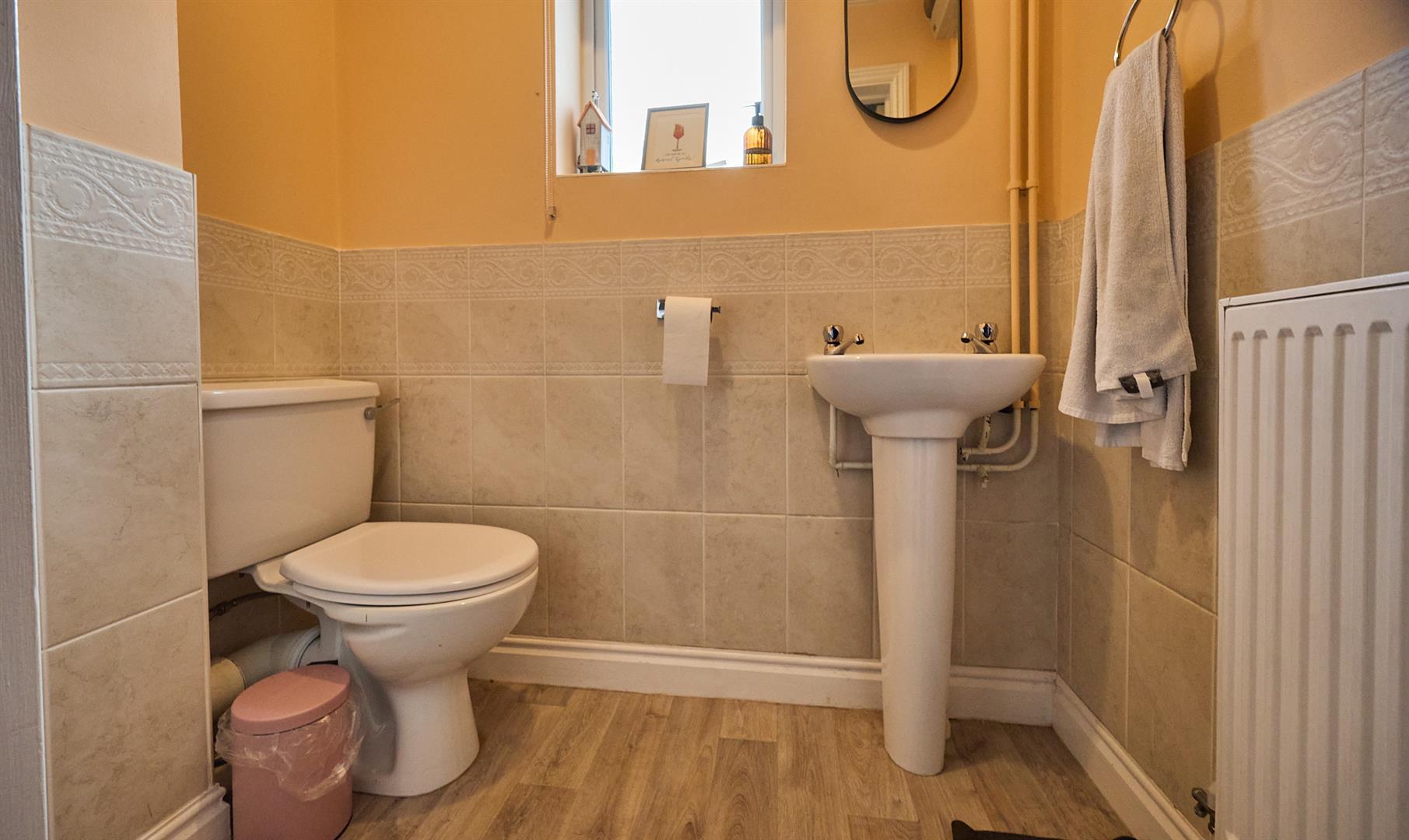 With white suite consisting low level WC, pedestal wash hand basin, contrasting half tiled surrounds, radiator. Wall mounted consumer unit.