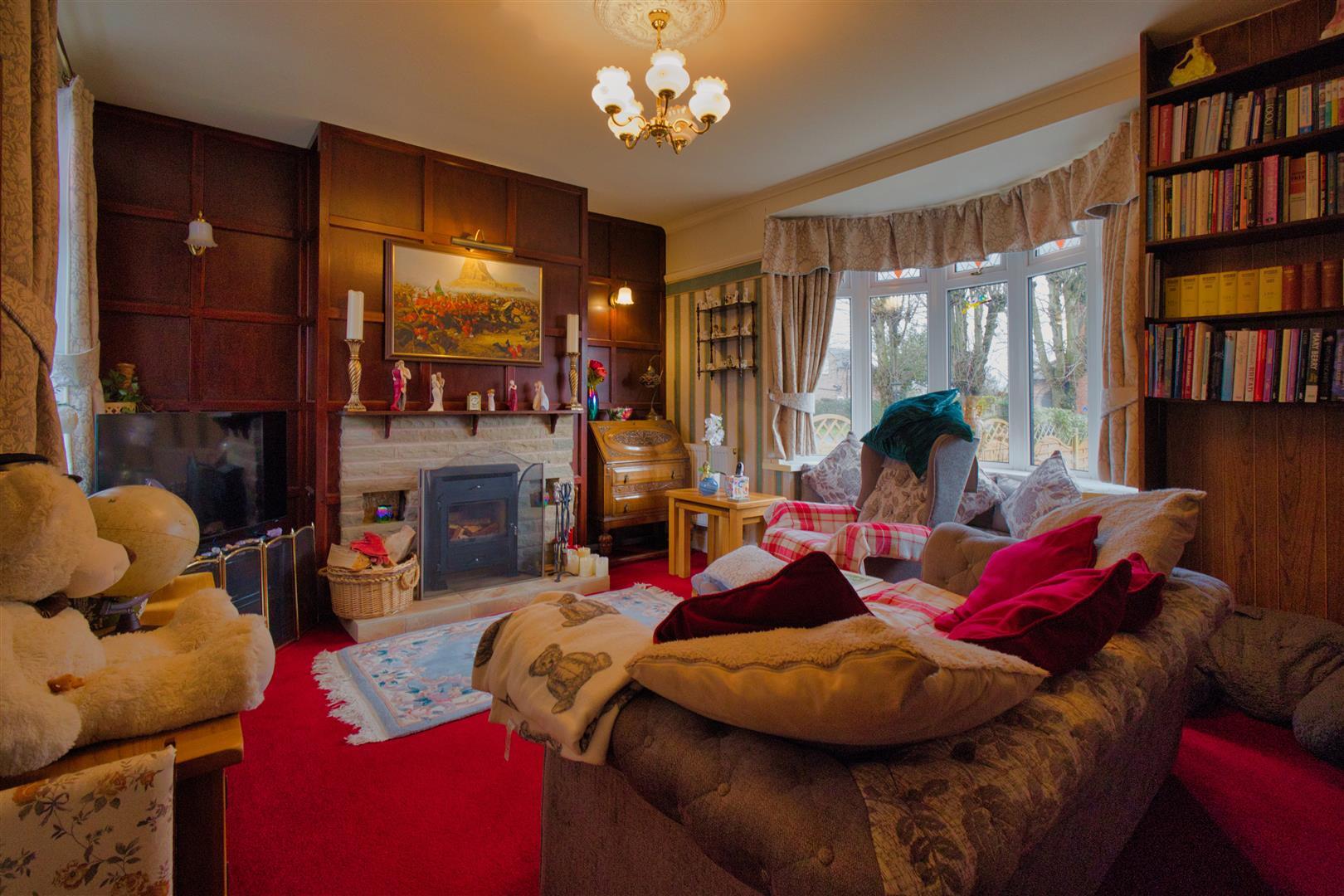 With feature stone fireplace with raised tiled hearth incorporating a black cast iron multifuel stove, two radiators, feature wood panelling to one wall and built in full height book shelf to another wall, four matching wall lights, TV aerial point.