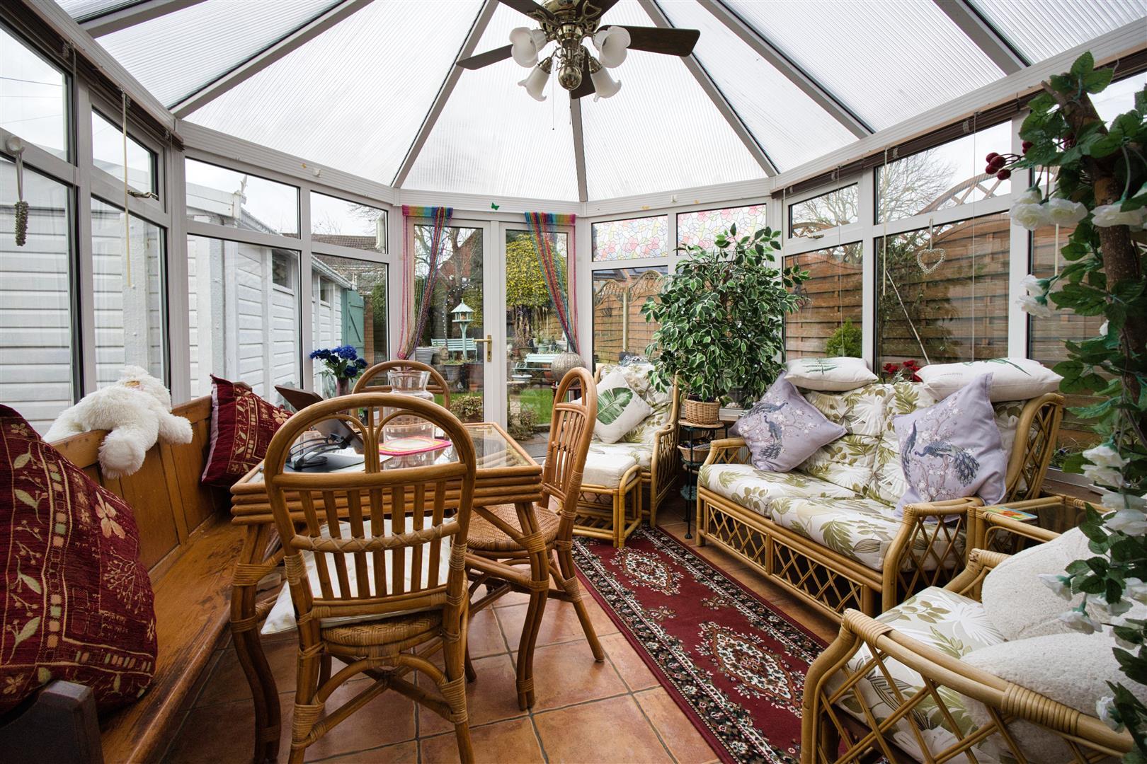 With ceramic tiled flooring, two double power points, ceiling fan light, conservatory blinds are included. UPVC SUDG French doors leading to the rear garden.