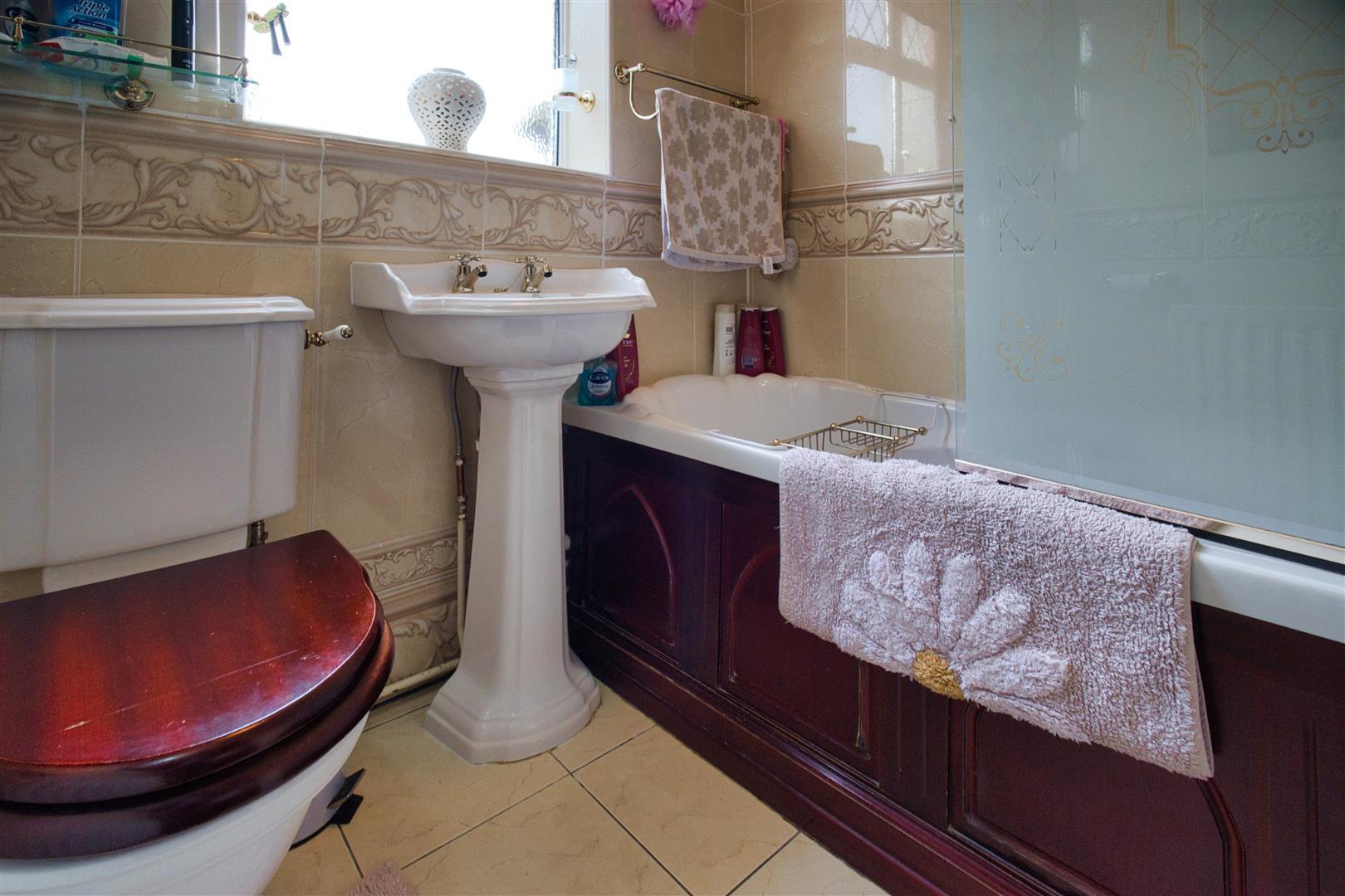 With white suite consisting panel bath, electric shower unit above glazed screen to side, pedestal wash hand basin, low level WC, contrasting fully tiled surrounds including the flooring, radiator and extractor fan.