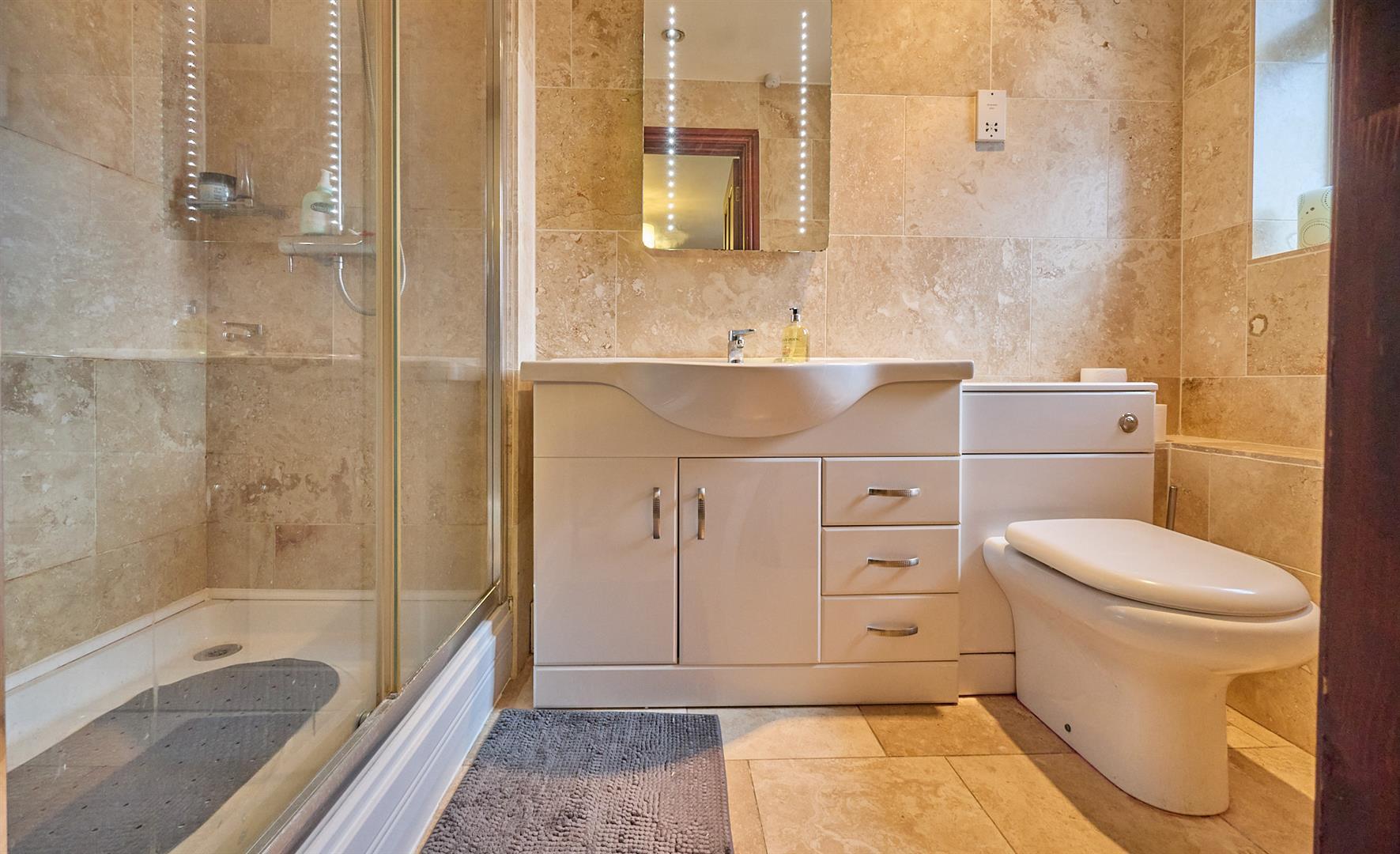 With white suite consisting of a roll top double ended panel bath with claw feet, mixer tap and shower attachment above. Pedestal wash hand basin and low level WC, fully tiled shower cubicle with glazed shower doors. Contrasting fully tiled surrounds including the flooring, chrome heated towel rail, inset ceiling spotlights and extractor fan. Door to the airing cupboard housing the cylinder fitted immersion heater for supplementary domestic hot water.