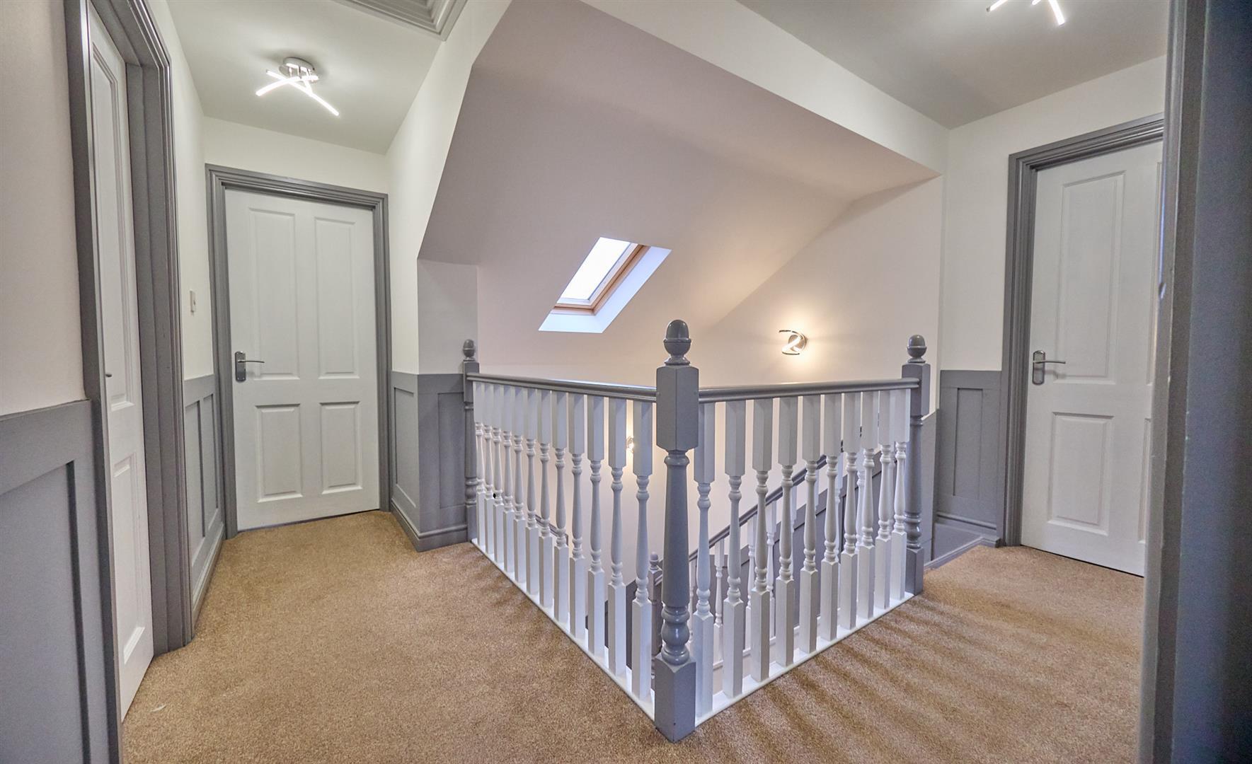 With a gallery landing with white spindle balustrades, wired in smoke alarm, grey wood panel surrounds, loft access.