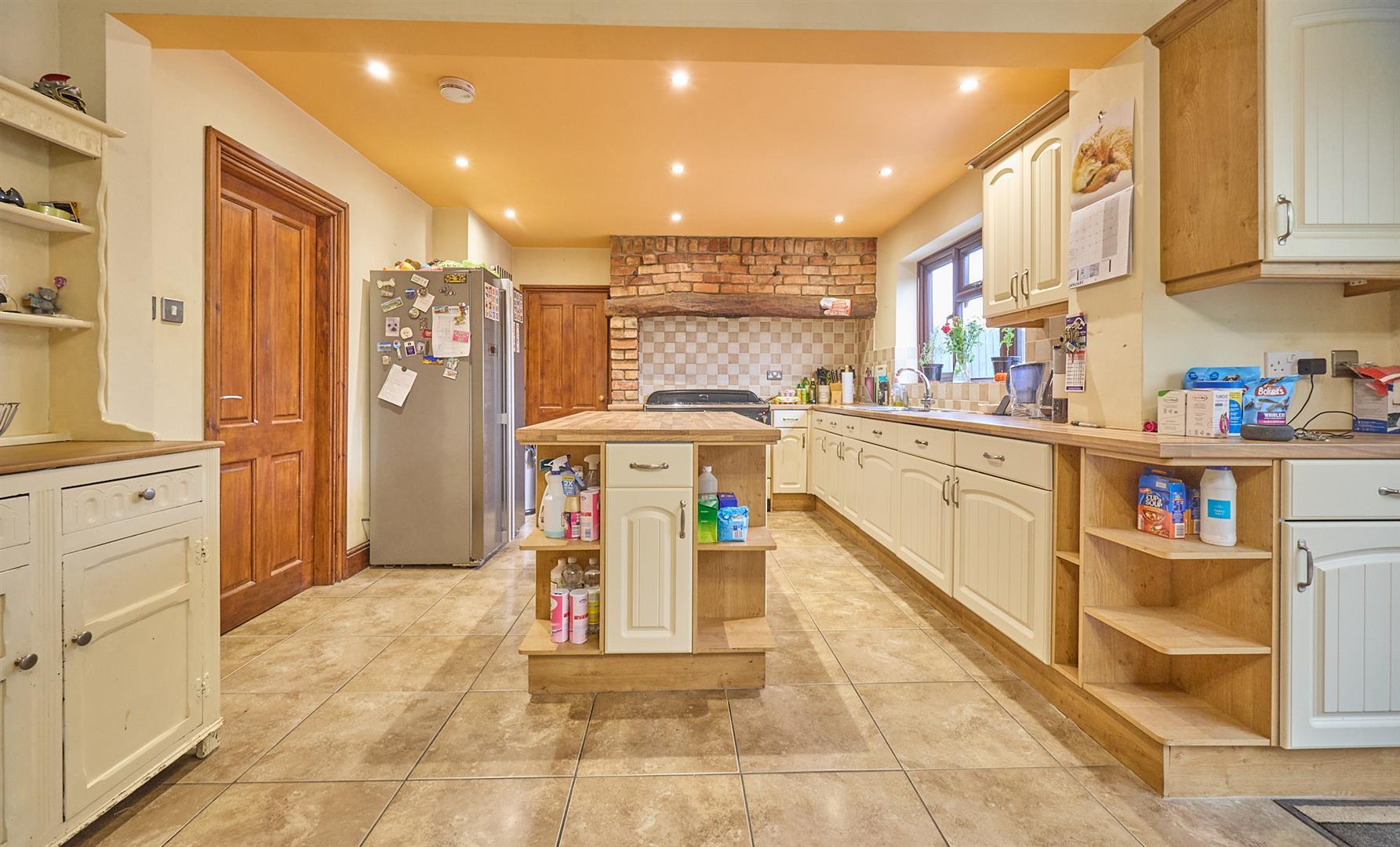 The kitchen with a range of cream fitted kitchen units consisting inset one and a half bowls single drainer stainless sink unit, mixer tap above, double base unit beneath. Further matching range of floor mounted cupboard units and drawers, contrasting walnut finished rill edge working surfaces above, tiled splashbacks, further matching wall mounted cupboard units, matching island unit with display shelving, cupboards, drawers and wine racks beneath. A Rangemaster cooker in matching cream and black consisting of a six ring gas hob unit, two ovens and grill beneath, integrated extractor above, feature hardwood beam and reclaimed brickwork above, ceramic tiled flooring, fashionable chrome vertical radiator, inset ceiling spotlights, wired in smoke alarm. The living/dining area with ceramic tile flooring, fashionable chrome radiator, coving to ceiling, SUDG sliding patio doors leads to