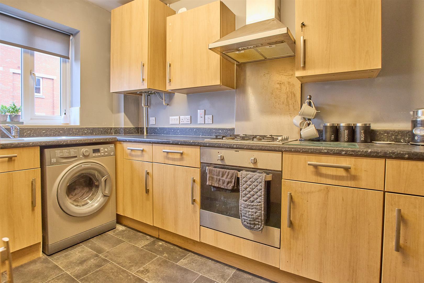 With a range of floor standing kitchen units with roll edge working surfaces above with inset drainer stainless steel sink with mixer tap. Integrated Zanussi oven with gas hob and extractor above. Space for a washing machine. Fridge Freezer included. Further range of matching wall mounted cupboard units, one housing the Gloworm gas boiler. Vinyl flooring and radiator.