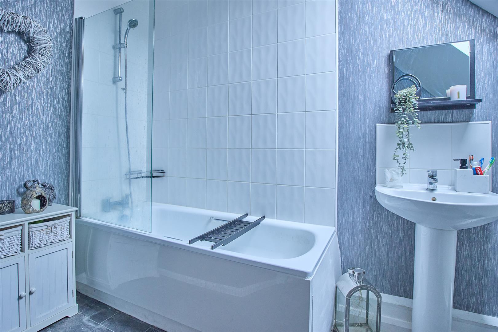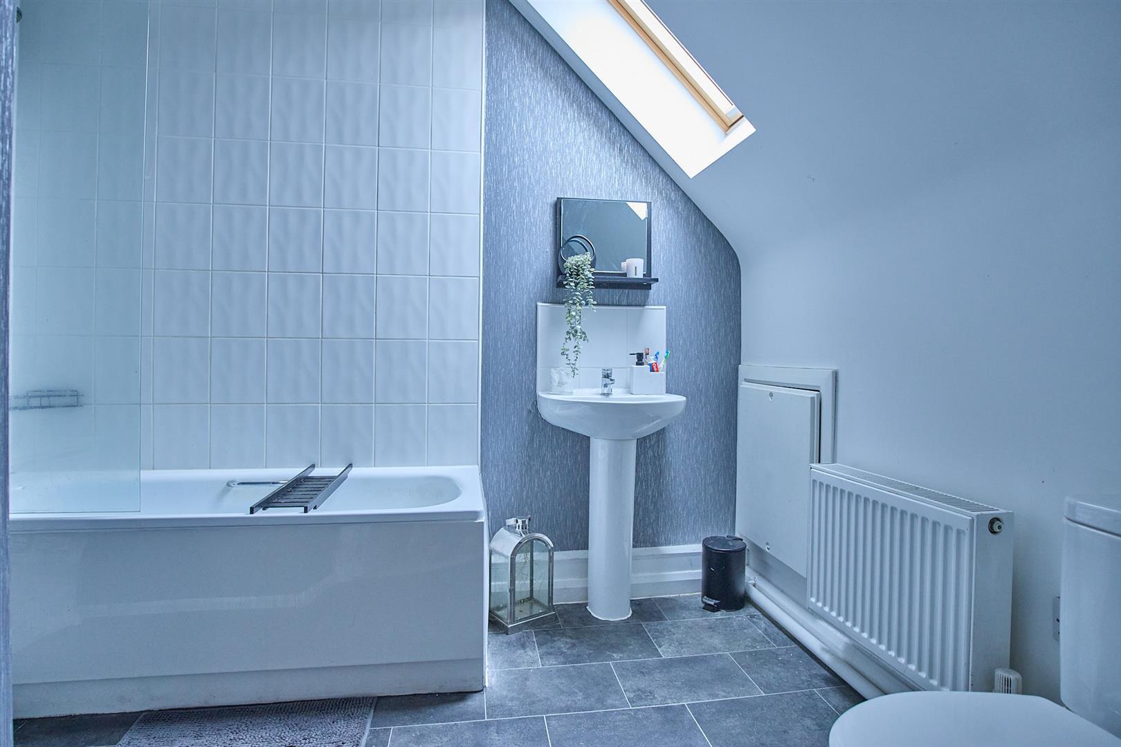 With a white panelled bath with mixer taps and shower attachment above, shower screen to side, low level WC, pedestal wash hand basin. Half tiled surrounds, radiator, vinyl flooring and Velux window.