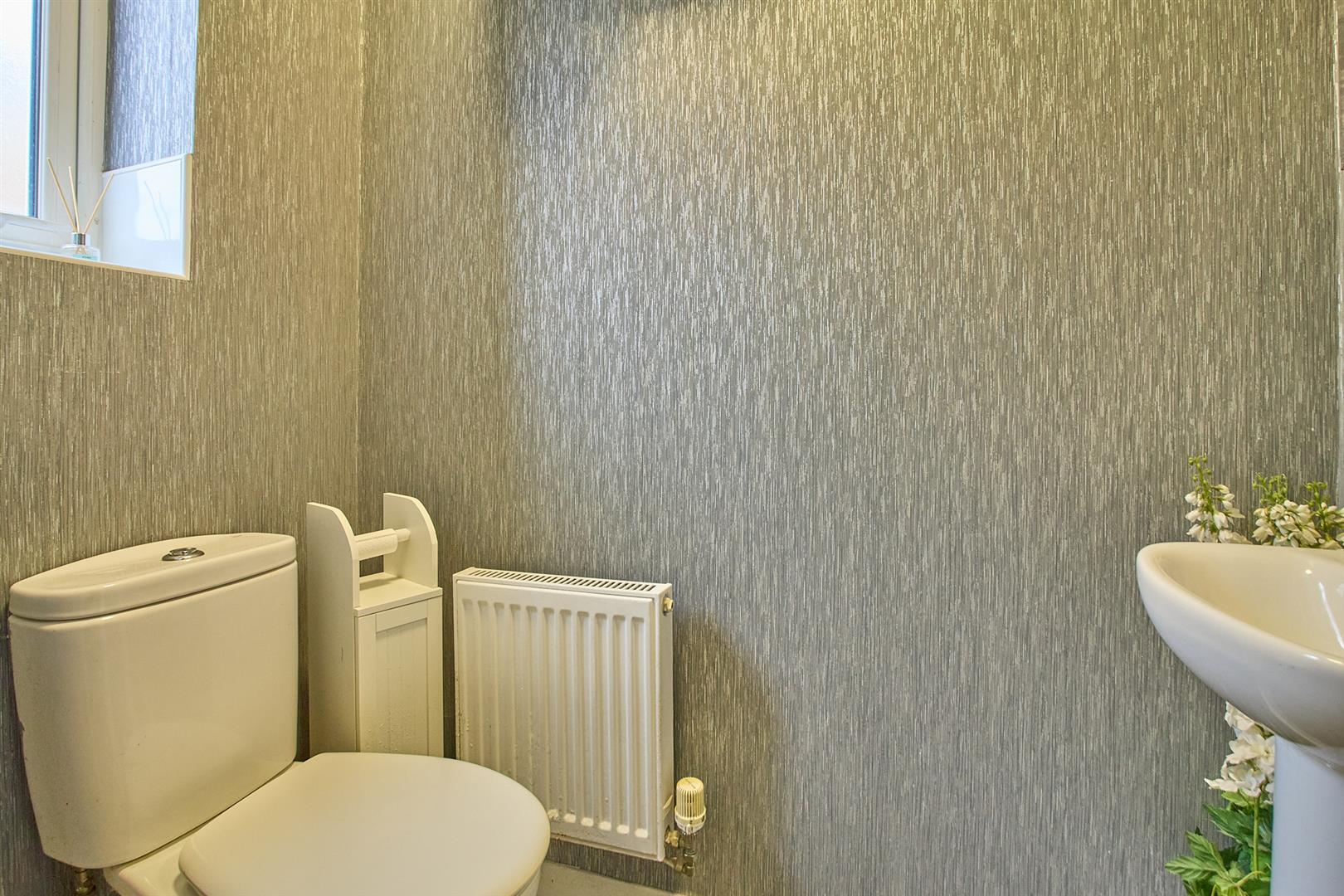 With low level WC, pedestal wash hand basin, radiator. Vinyl flooring, extractor fan and also housing the consumer unit.