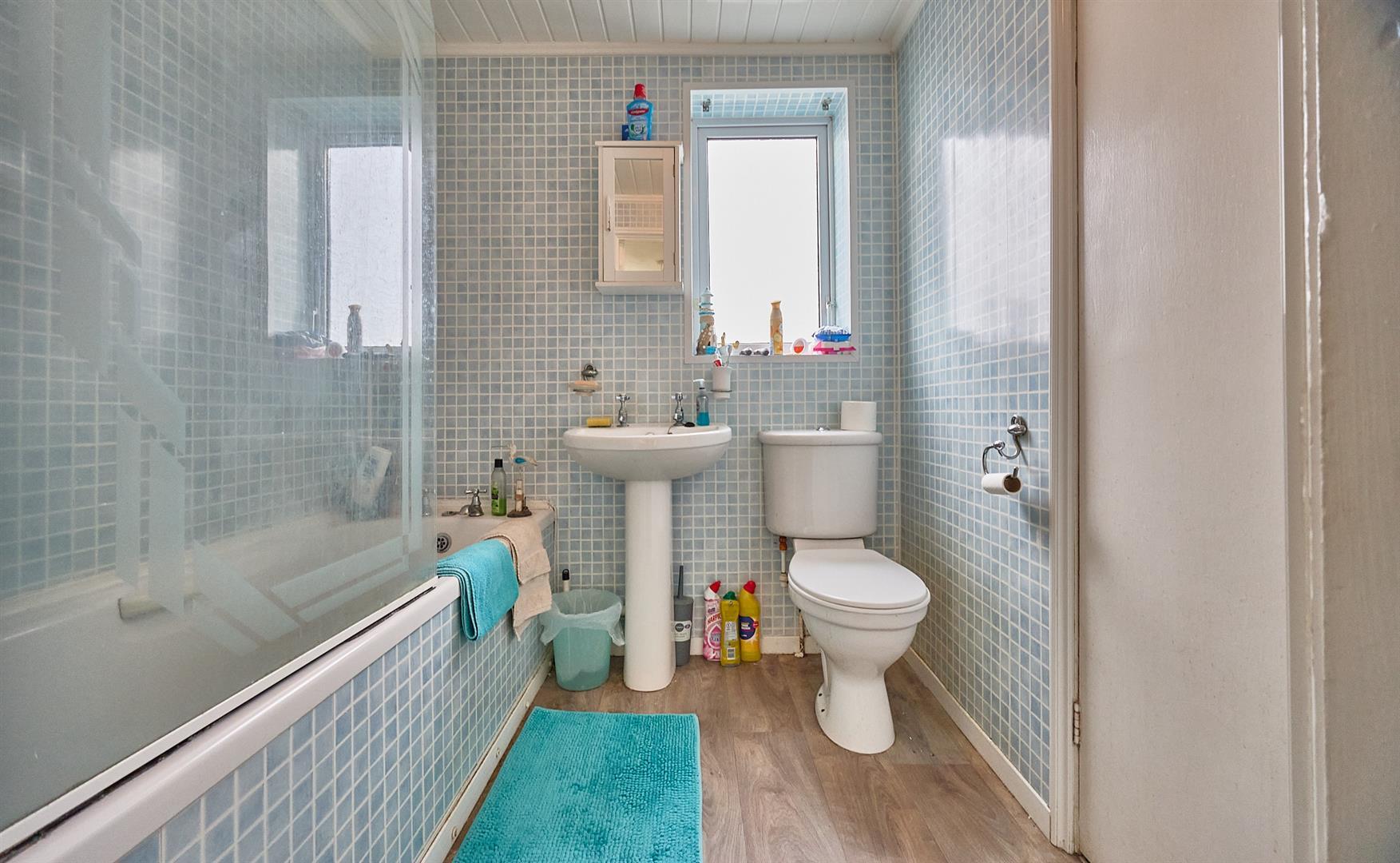 With white suite consisting panelled bath, electric shower unit above, glazed shower screen to side. Pedestal wash hand basin and low level WC. Contrasting tiled panelled surrounds and laminate wood strip flooring, door to the airing cupboard housing the Worcester gas condensing combination boiler for central heating and domestic hot water.