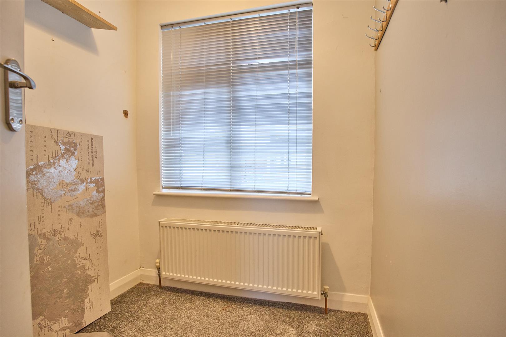 With stairway to the first floor, radiator. Laminate wood strip flooring, smoke alarm. Door to an useful under stairs storage cupboard. White panelled interior door to