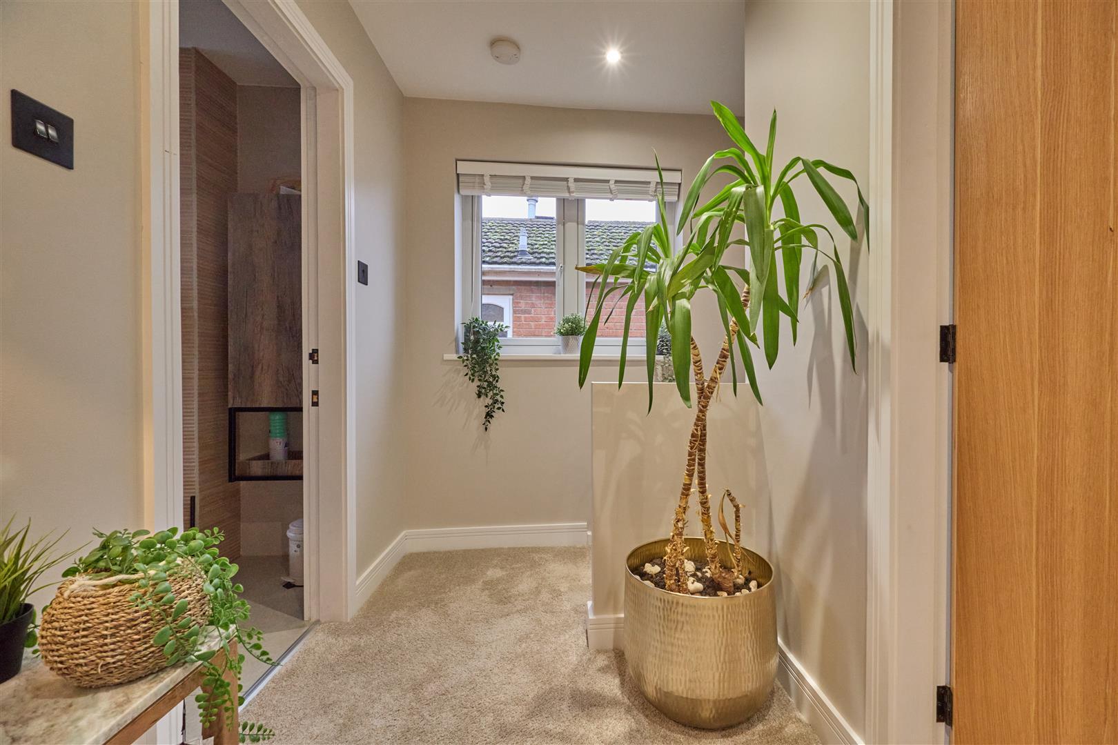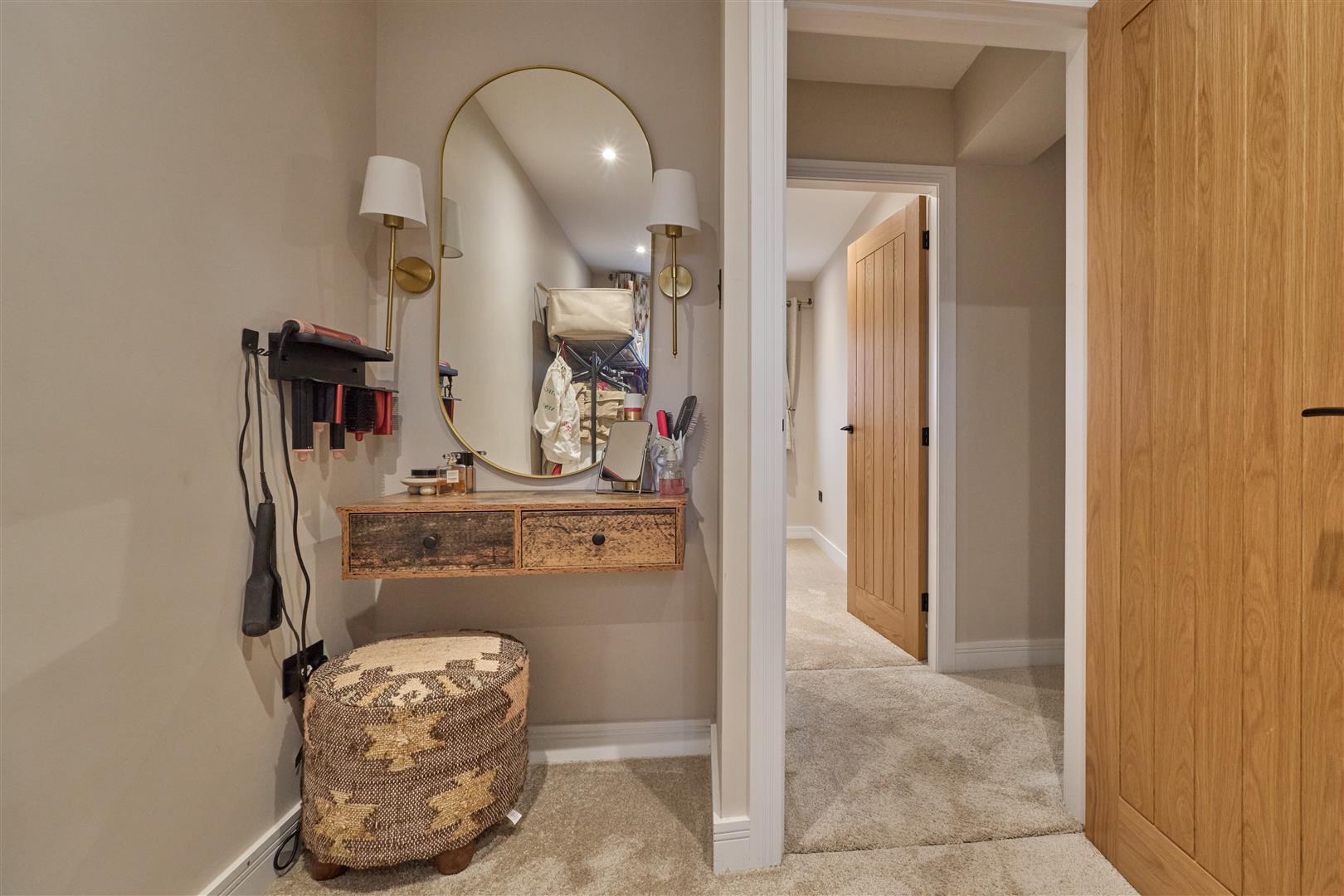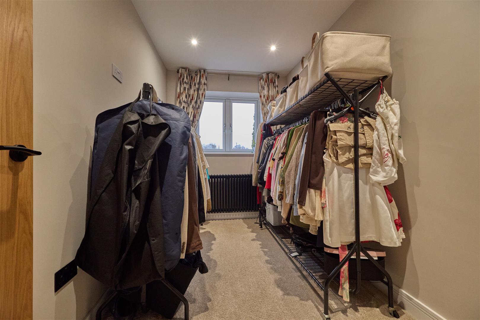 With Amtico flooring, inset ceiling spotlights. Attractive radiator, range of built in wardrobes with rails and shelving as well as a fitted seat and cupboards above. There is also a door to a useful under stairs storage cupboard which houses the full house water filtration system providing filtered water throughout the property and stairway to first floor. Attractive oak panelled and glazed interior door to