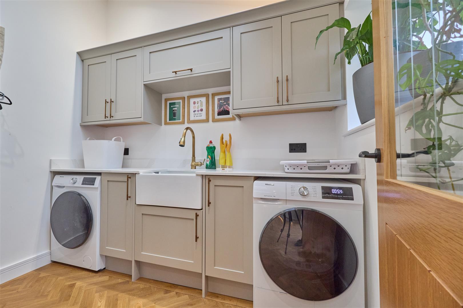 With a solid range of solid wooden kitchen cupboards with an inset Belfast sink with mixer taps above. Plumbing for automatic washing machine and space for a tumble drier. Further range of wall mounted cupboard units, Velux window, inset ceiling spotlights, tall radiator and Amtico flooring.