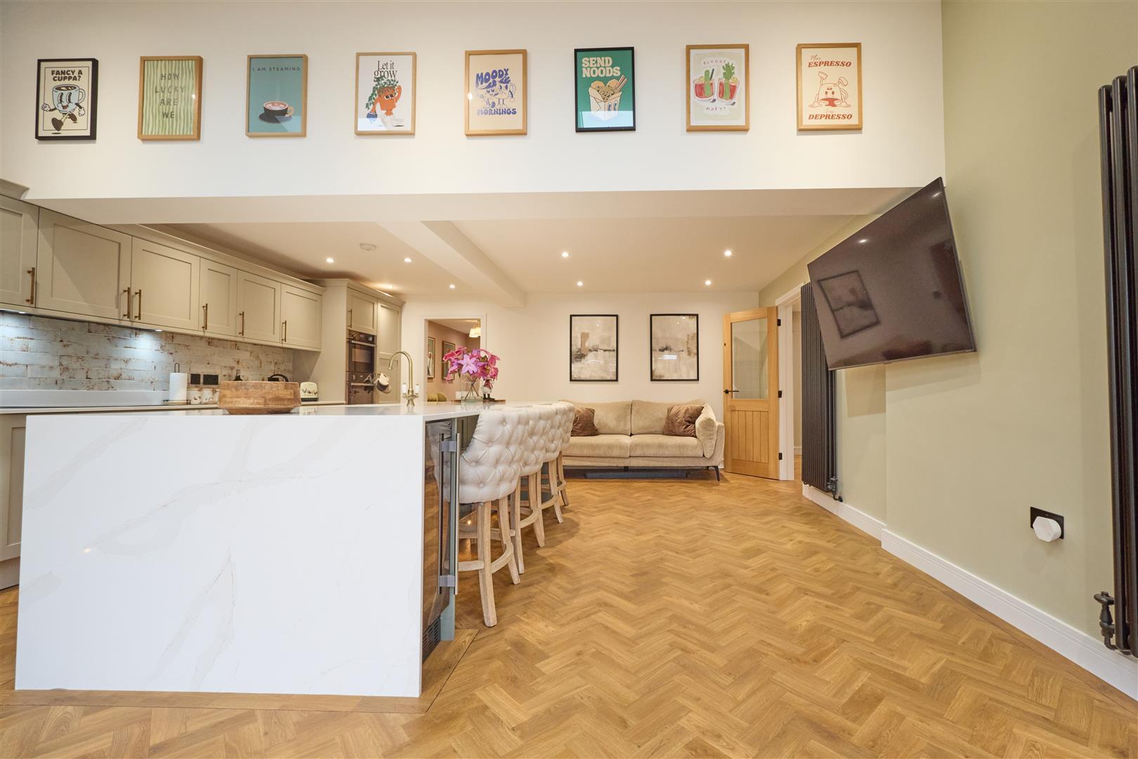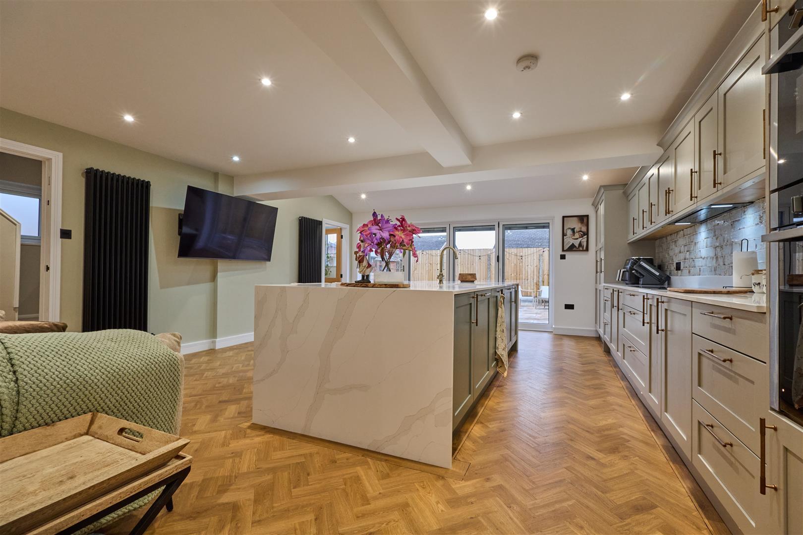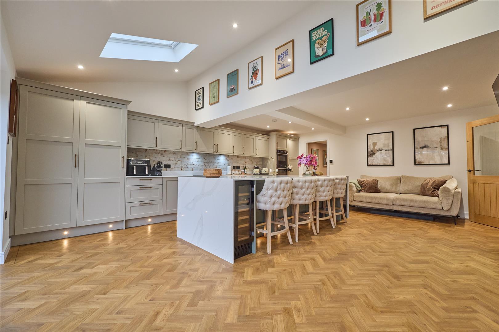 With solid oak fitted cupboards and Quartz working surfaces as well as a Quartz large island unit with inset sink with mixer tap above and cupboard beneath. There is a range of integrated Neff appliances consisting of a microwave oven as well as an electric oven and grill, integrated fridge freezer, Neff induction hob, dishwasher, pull out bin, two wine coolers and a tall larder cupboard as well as a further range of wall mounted cupboard units. Tiled splashbacks, inset ceiling spotlights and two Velux windows which are electric. Bi-folding doors which open out to the rear garden. Four breakfast stools which are also included. Amitico flooring. Two fashionable radiators. Wall mounted electric control Velux windows, attractive oak panelled and glazed door to