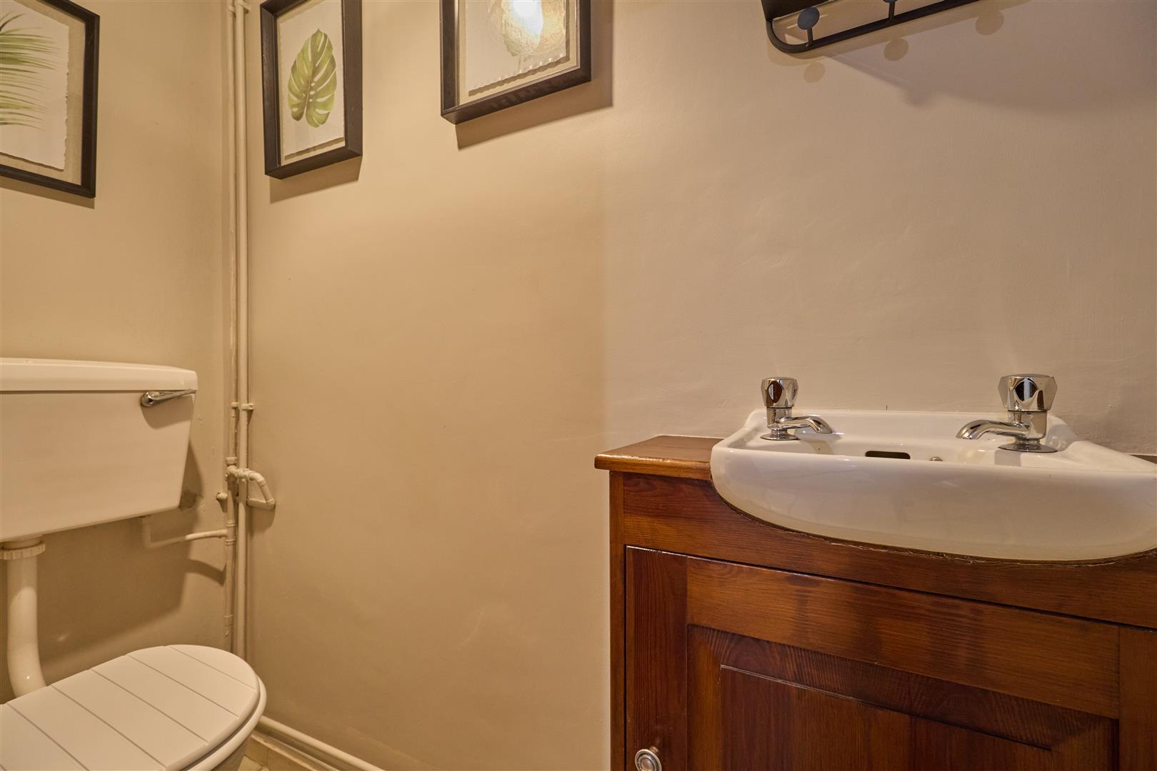 With tiled flooring and low level WC, pedestal wash hand basin. Oak panelled and glazed door to
