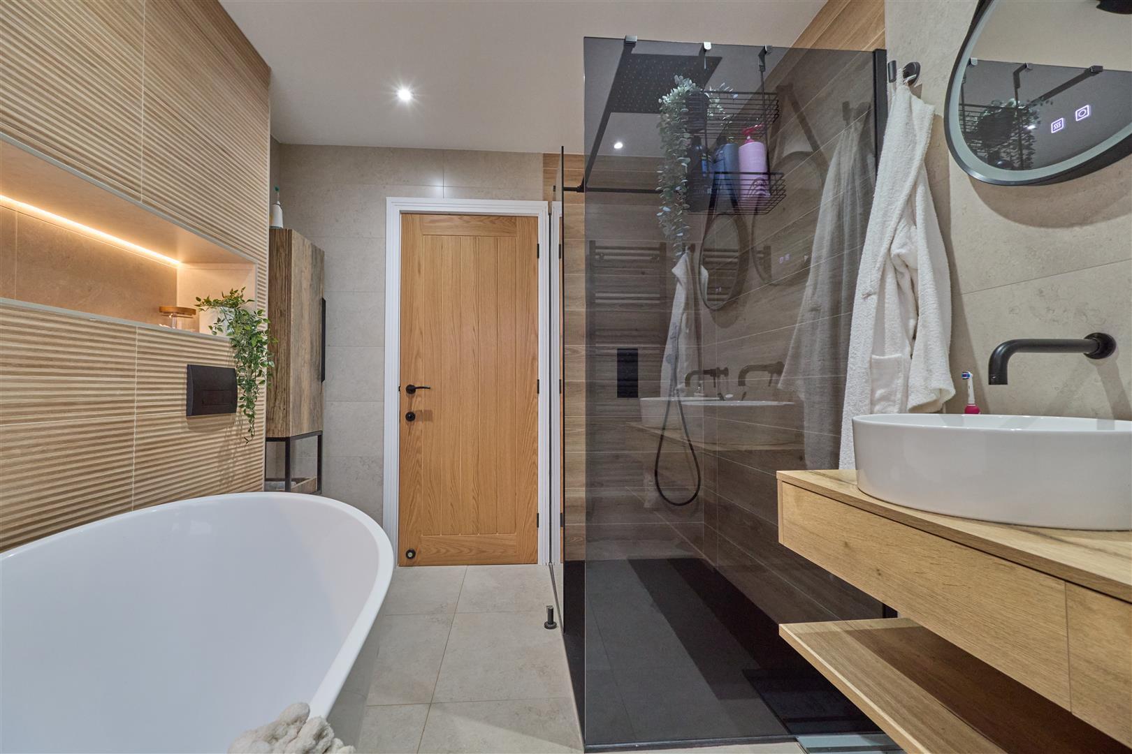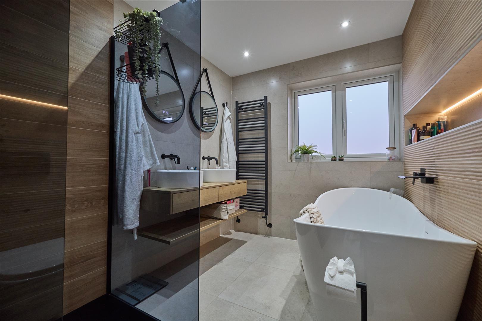 With four piece suite. Fully tiled with an inset useful niche for storage with lighting. Roll top bath and a large separate shower cubicle with a ceiling rainfall shower as well as a handheld attachment. Fully tiled surrounds. His and hers sinks with drawers and shelf beneath. Two wall mounted mirrors which are anti fog with lighting. Tall heated towel rail. Inset ceiling spotlights and extractor fan. Wall mounted fitted bathroom cabinet. Door to