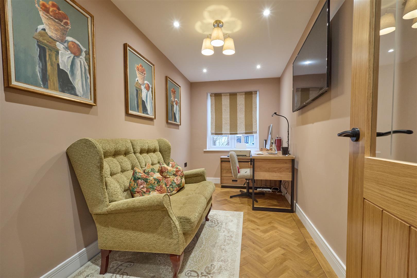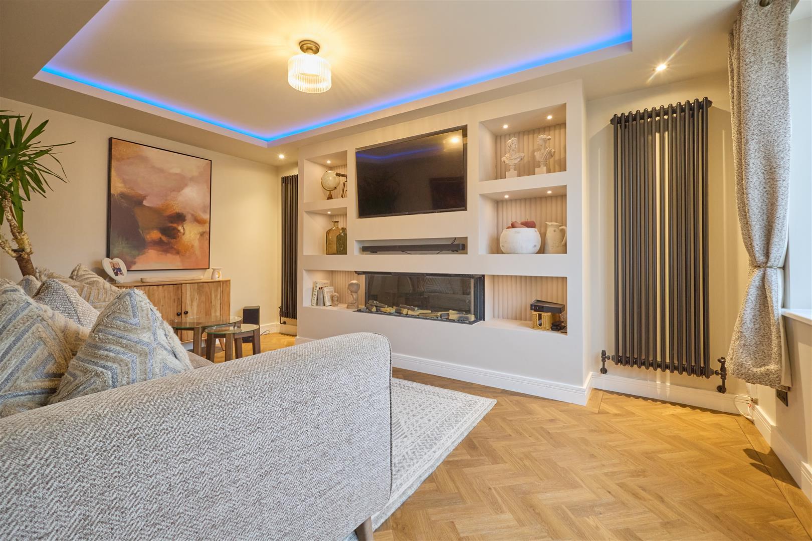 With Amtico flooring and a built in media wall as well and log effect electric fire with lighting to side alcoves. Inset ceiling spotlights. Two tall fashionable radiators, TV aerial point, telephone point and inset lighting to ceiling. Sliding door to