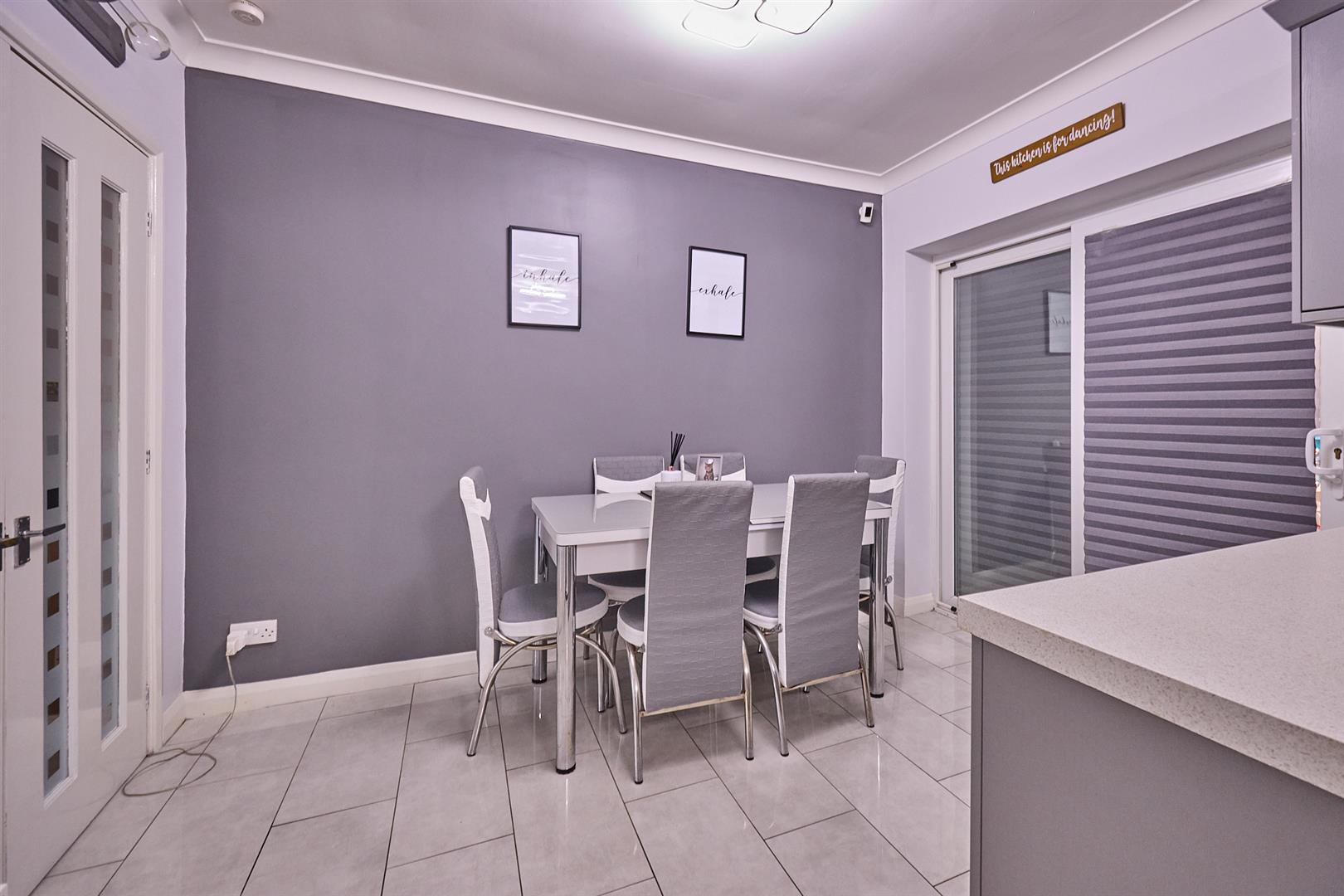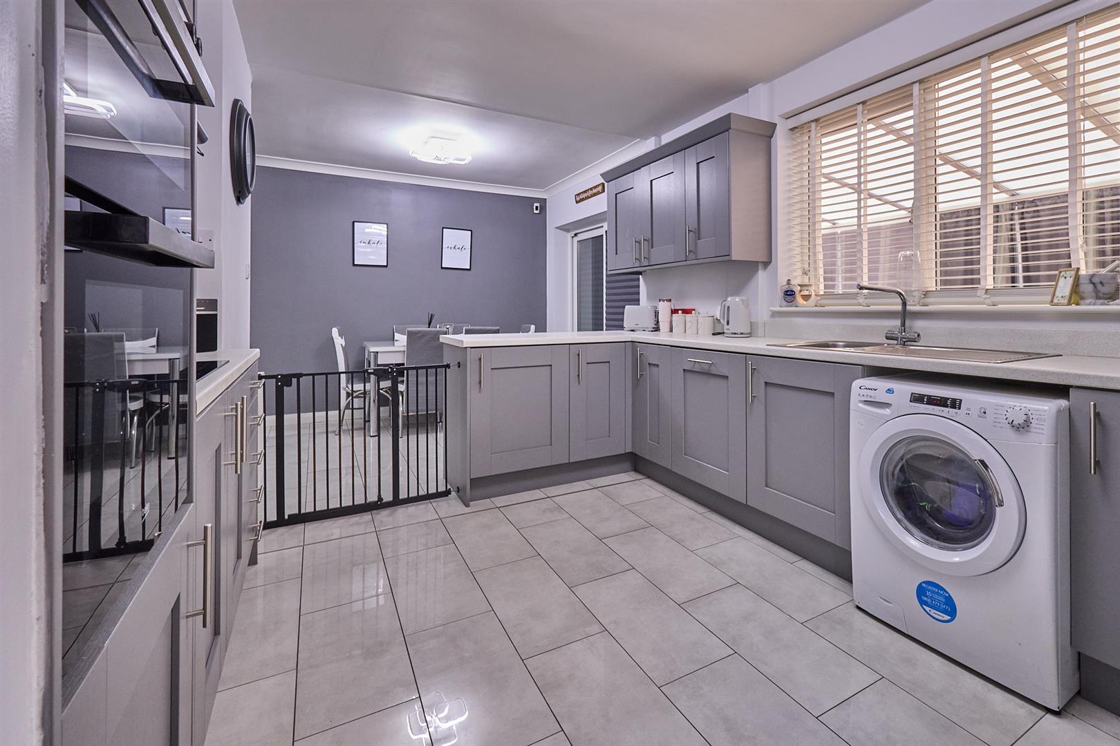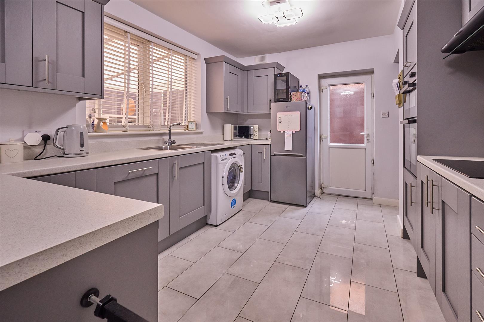 The refitted kitchen with a fashionable range of matt grey wood grain fitted kitchen units with soft close doors consisting in set single drainer stainless steel sink, mixer tap above, cupboard beneath. Further matching range of floor mounted cupboard units, five drawer unit, contrasting roll edge working surfaces above with inset five ring induction hob unit, integrated extractor above. Matching up stands, further matching range of wall mounted cupboard units. Integrated dishwasher, appliance recess points including plumbing for automatic washing machine. There is also a walk in under stairs pantry with fitted shelving, porcelain tiled flooring, UPVC SUDG door to the side of the property. The dining area with porcelain tile flooring, radiator, coving to ceiling, UPVC SUDG sliding patio doors to