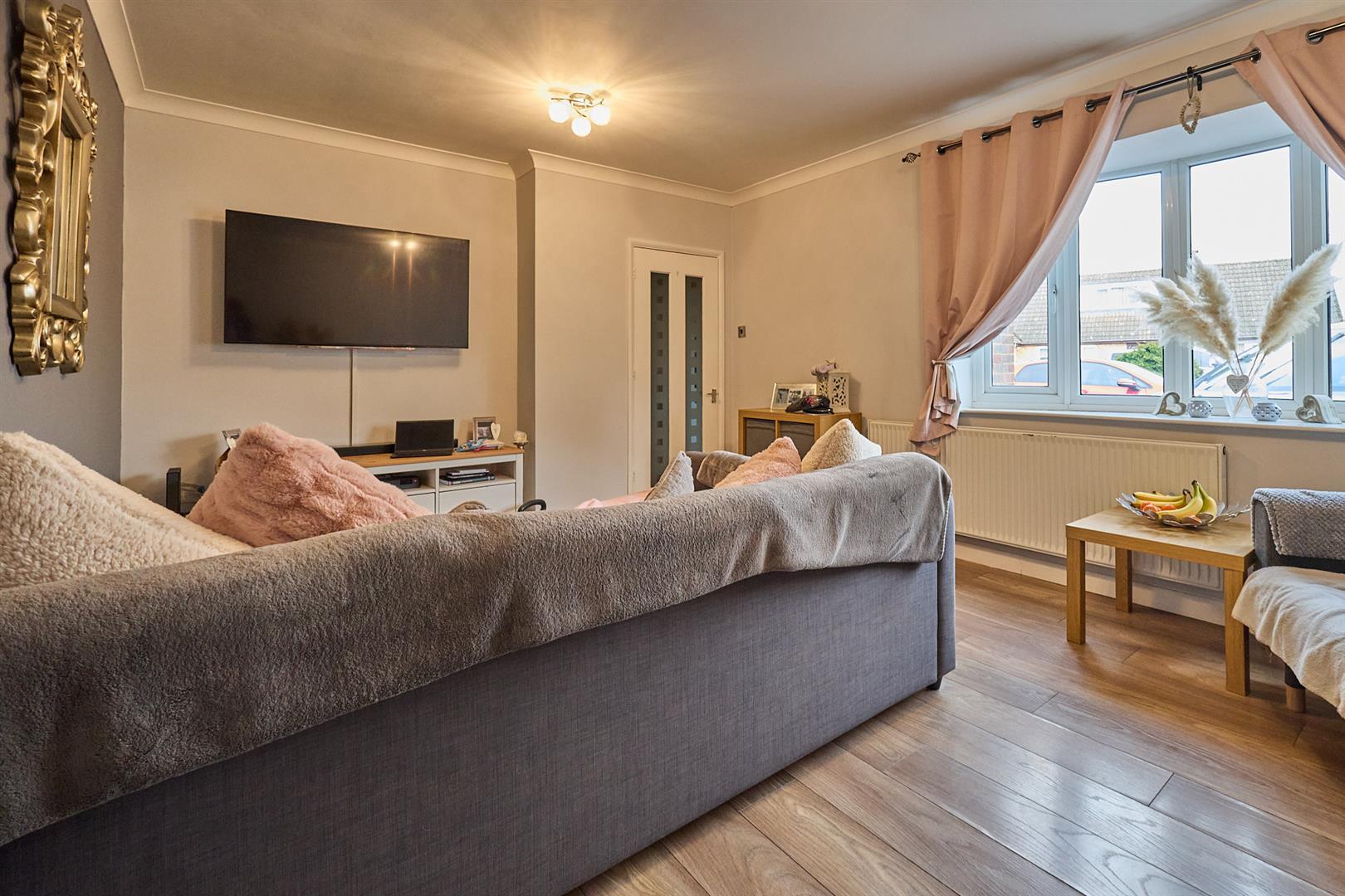 With oak finished laminate wood strip flooring. single panel radiator, coving to ceiling, UPVC SUDG bay window to front, white wood panelled and glazed double doors to