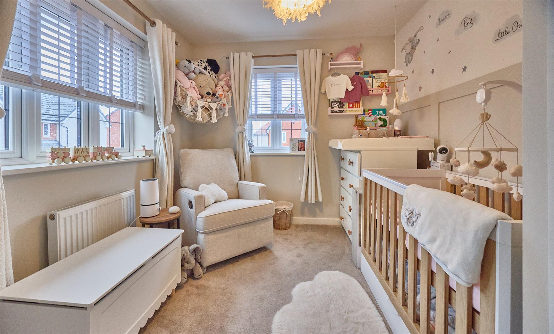 With grey oak finish laminate wood strip flooring, double panelled radiator. Wired in smoke alarm. Doorbell chimes. Dogleg stairway to first floor landing with useful under stairs storage cupboard beneath housing the consumer unit. Oak panelled interior door to