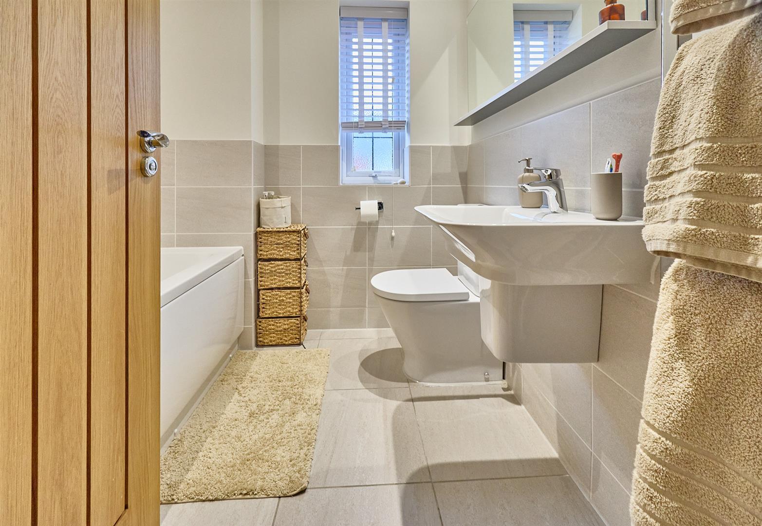 With white suite consisting panelled bath, mixer tap and shower attachment above, wall mounted sink unit and low level WC, contrasting tiled surrounds including the flooring, chrome heated towel rail, shaver point and inset ceiling spotlights. Extractor fan.