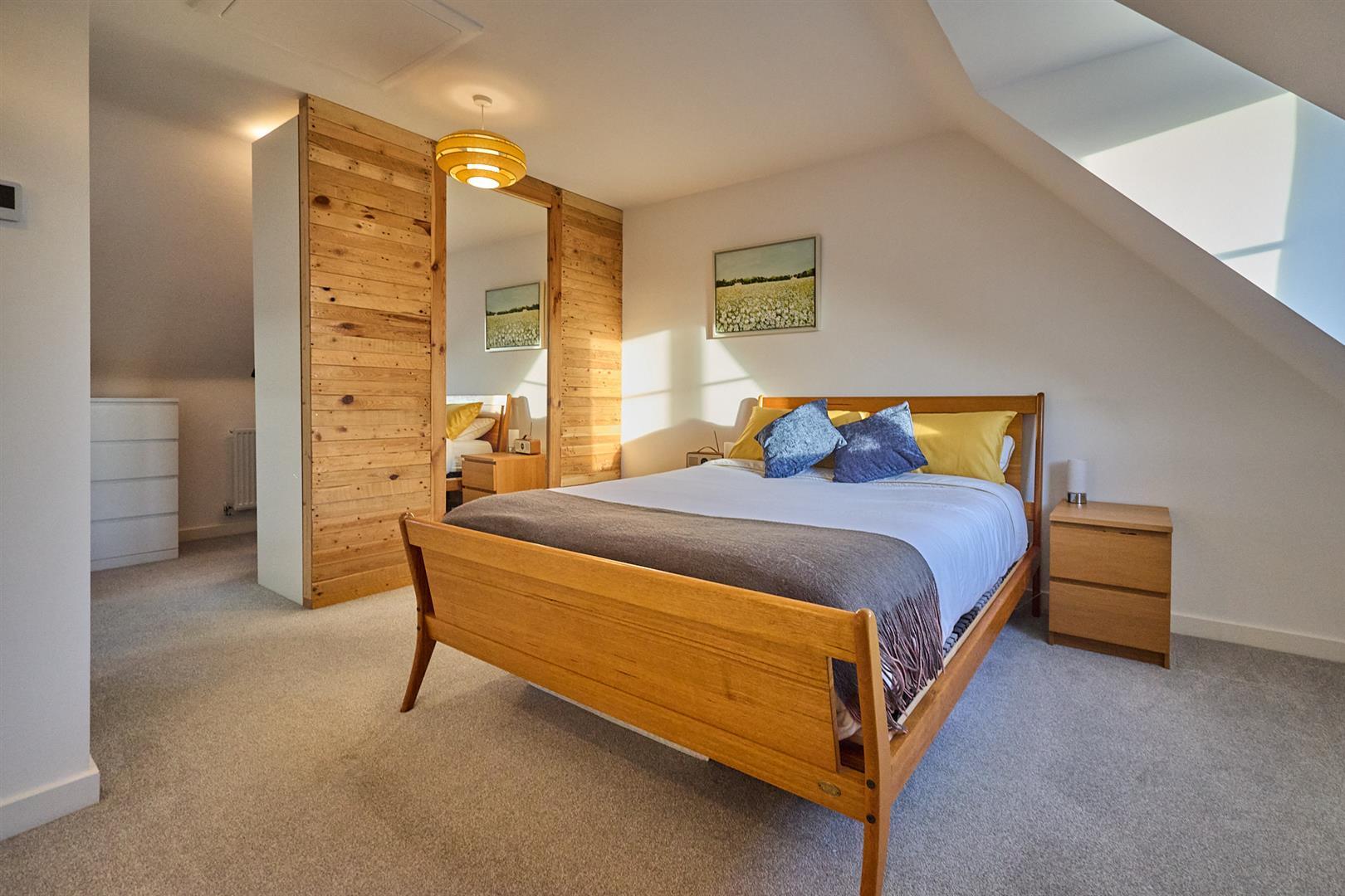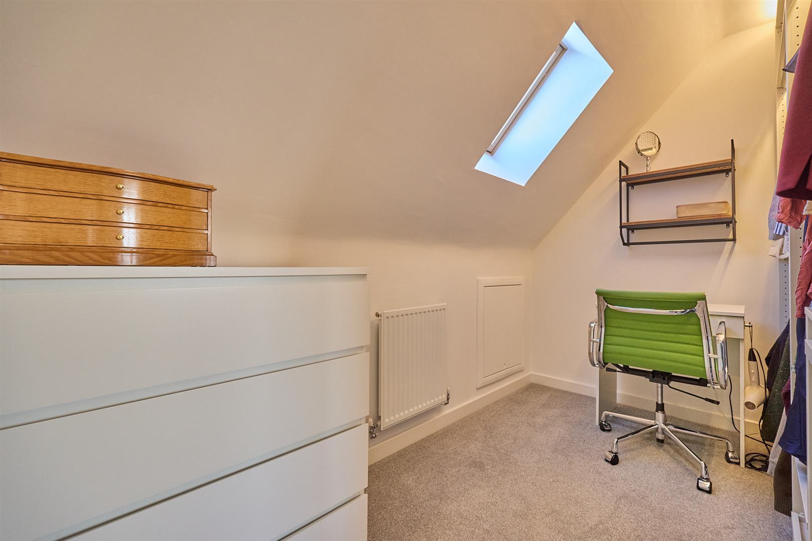 With built in bedroom furniture consisting of open wardrobes and shelving with concealed lighting, hanging rails and shelves, further built in storage cupboards in white with further pull out cupboard, two radiators, wireless digital thermostat for the central heating on the top floor. Velux window in the dressing area. Door to