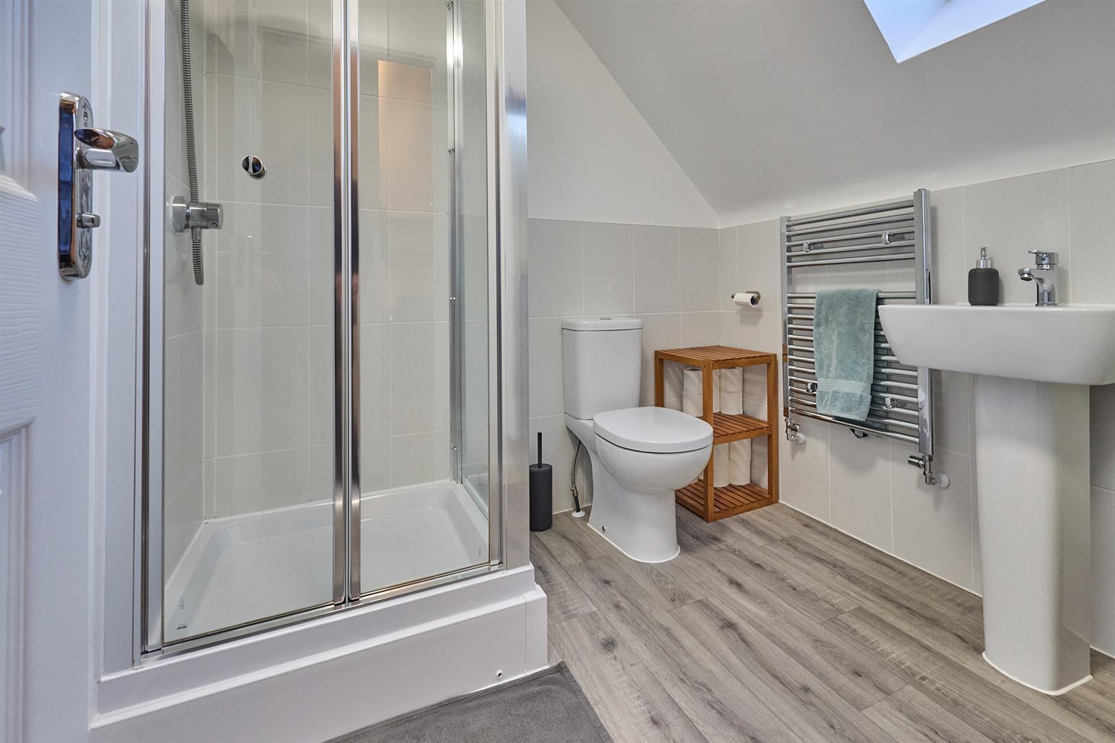 With a white suite consisting of a tiled shower cubicle with glazed shower screen and glazed shower doors, pedestal wash hand basin, low level WC, contrasting tiled surrounds, chrome heated towel rail, shaver point, extractor fan, double glazed Velux window, wall mounted mirror fronted bathroom cabinet.