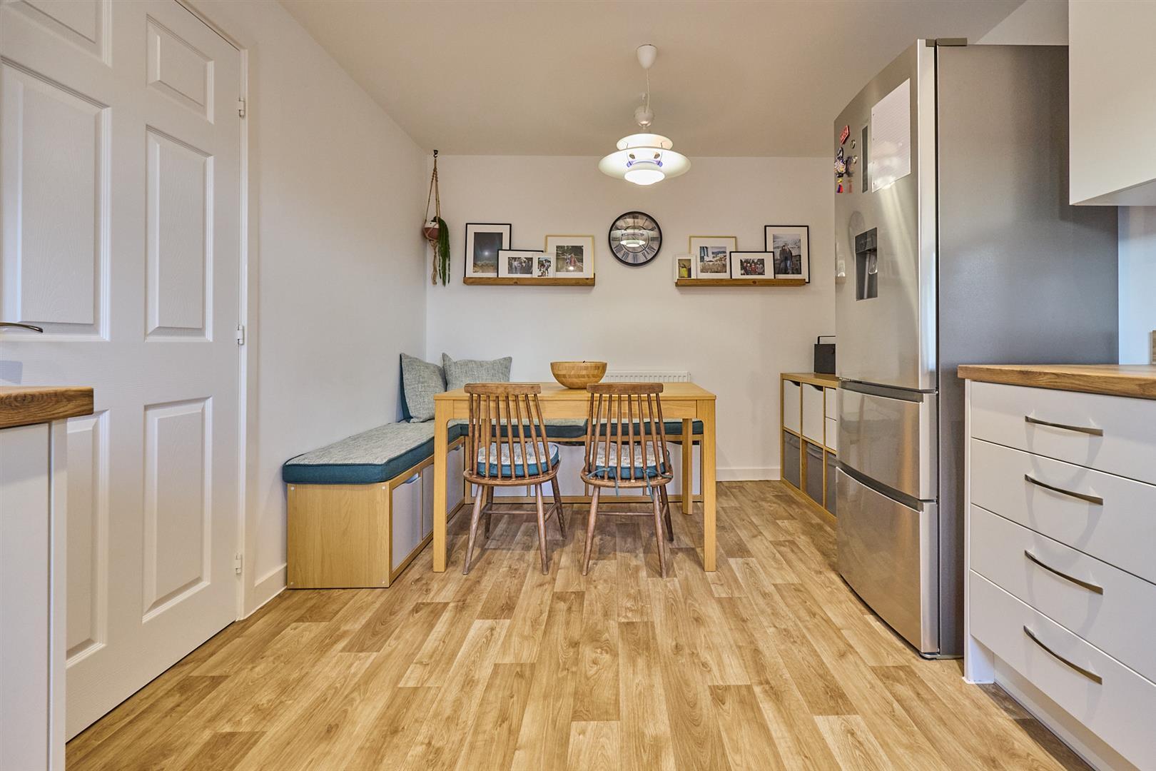 With a fashionable range of matt white fitted kitchen units with soft closed doors, inset one and a half bowl single drainer stainless steel sink, mixer tap above, cupboard beneath. Further matching floor mounted cupboard units and four drawer unit, contrasting oak style wood grain working surfaces above with inset four ring induction hob unit, single fan assisted oven with grill beneath, integrated extractor above. Matching up stands, further matching range of wall mounted cupboard units one concealing the Ideal gas condensing combination boiler for central heating and domestic hot water, integrated dishwasher and washing machine, double panel radiator, inset ceiling spotlights, some USB points.