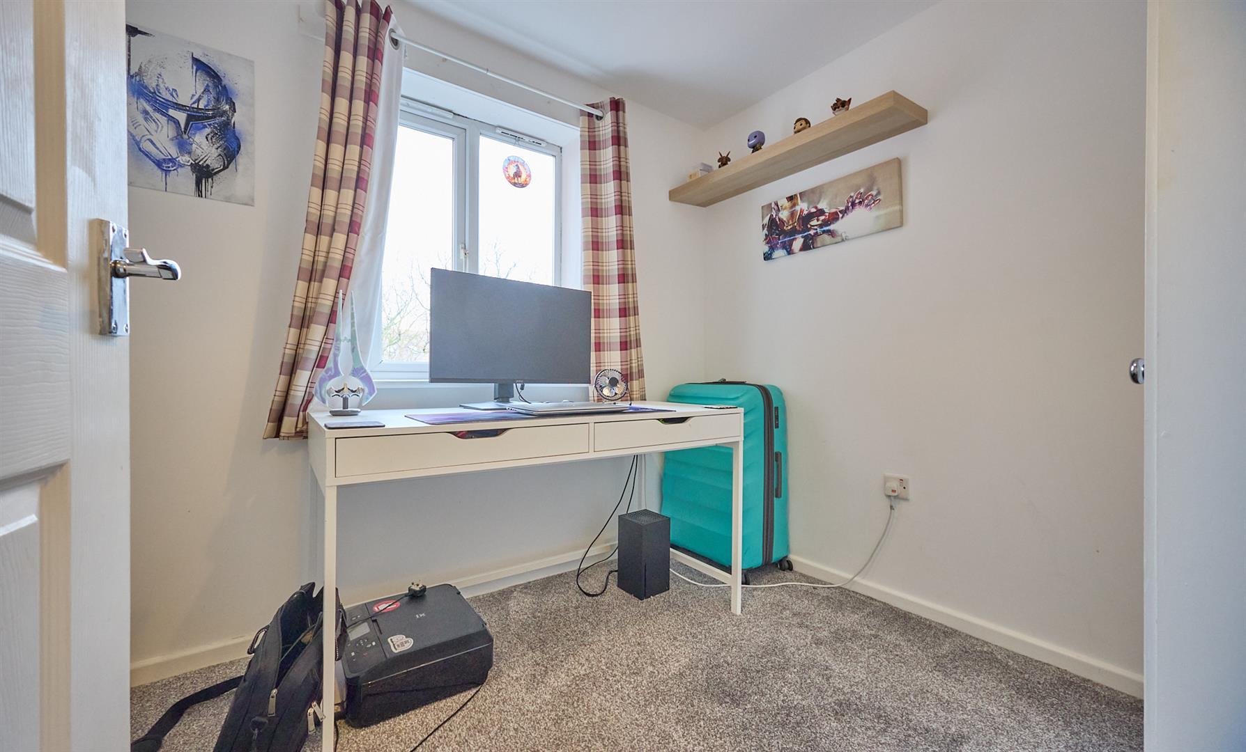 With laminate wood strip flooring, wired in smoke alarms. Door to the useful storage cupboard with shelving, double panelled radiator. Attractive white panelled interior door to