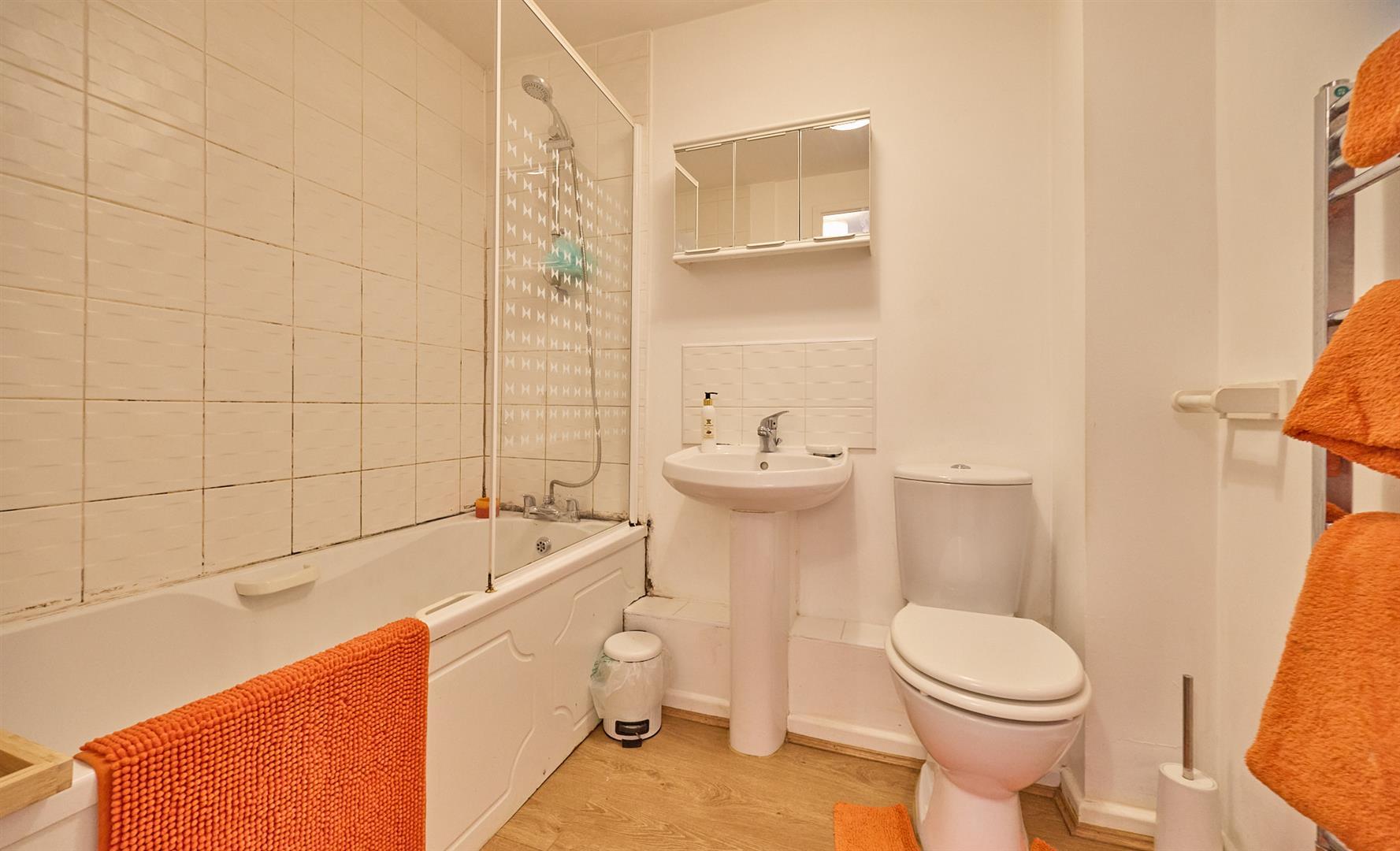 With white suite consisting panelled bath with glazed shower screen and tiled surrounds, mixer shower, low level WC and pedestal wash hand basin, chrome heated towel rail and laminate wood strip flooring. Door to