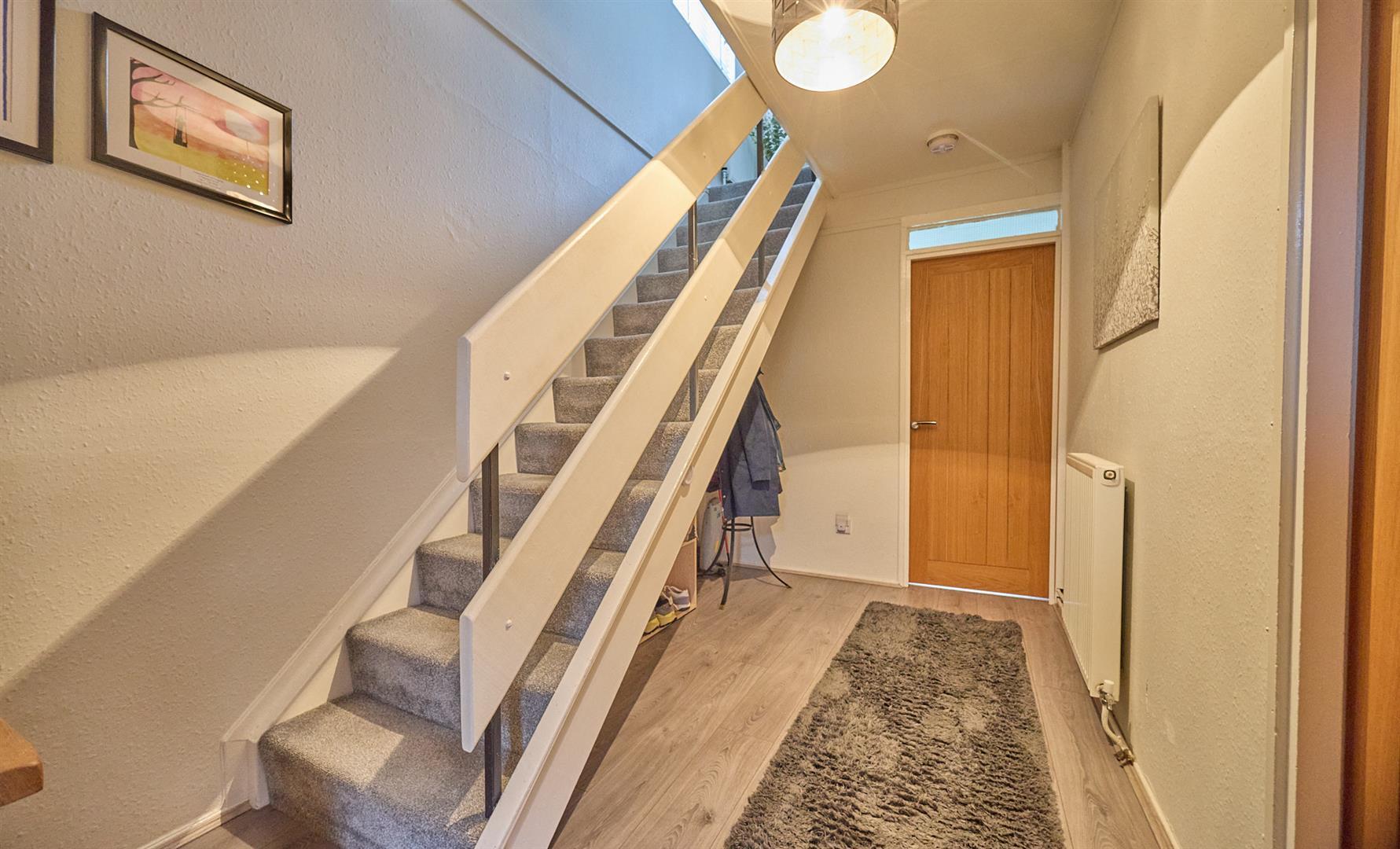 With stairway to the first floor, laminate wood strip flooring, smoke alarm, radiator and consumer unit. Panelled door to