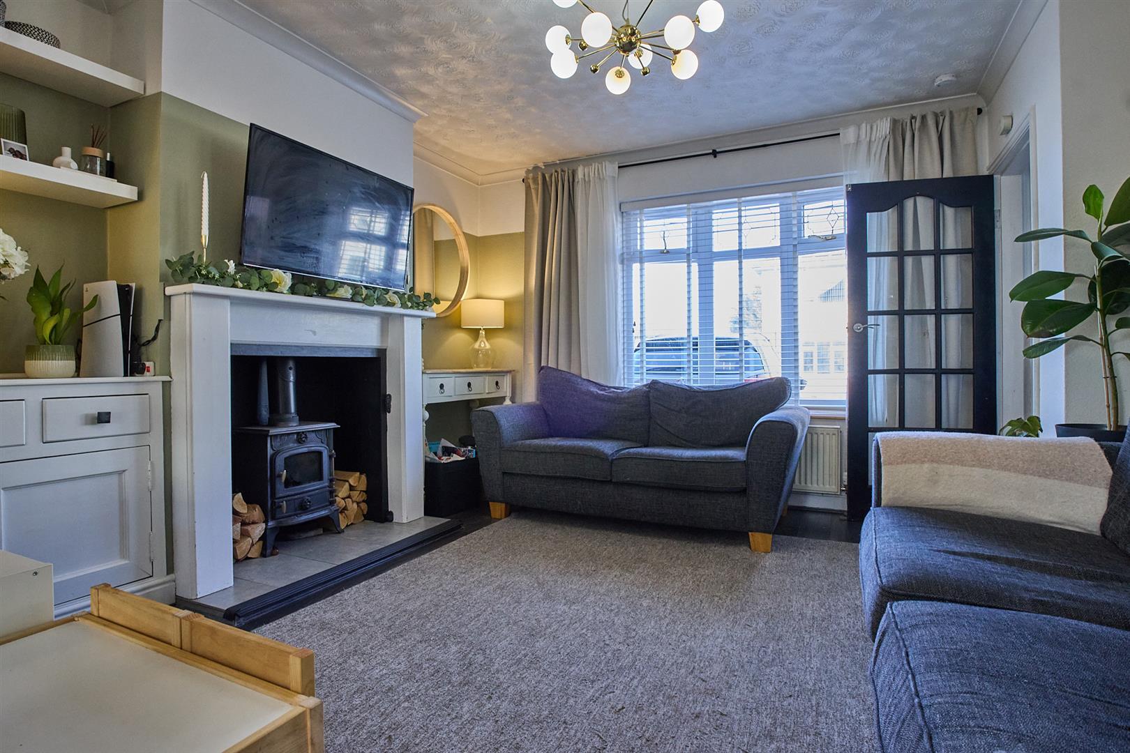 With feature fireplace having ornamental white wooden surround raised grey ceramic tiled hearth, pine mantle above incorporative a black cast iron wood burning stove, wall panelling, fitted storage cupboards and drawers to side alcove, housing the gas meters, grey oak finish laminate wood strip flooring, radiator, coving to ceiling, TV and telephone point including Sky and UPVC SUDG and leaded bow window to front.