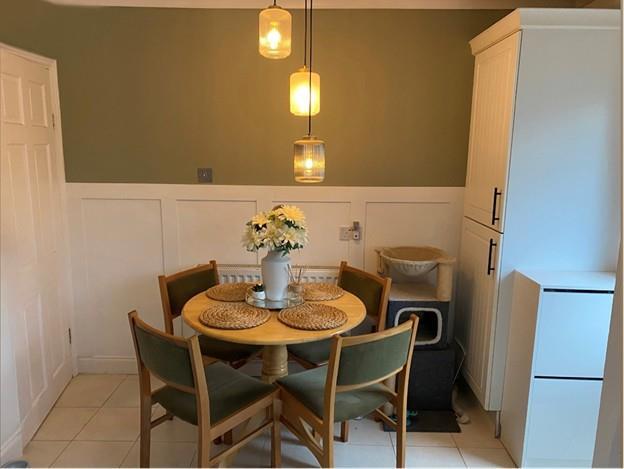 With a fashionable range of matt white fitted kitchen units consisting inset single drainer ceramic sink unit mixer taps above, double base unit beneath. Further range of floor mounted cupboard units and drawers, contrasting walnut finish roll edge working surfaces above and tiled splash backs. Further matching range of wall mounted cupboard units including one double display unit with glazed doors, appliance recess points, Beko range cooker included with 7 ring gas hob unit, two ovens and a grill beneath, large integrated extractor above, integrated fridge freezer, plumbing for automatic washing machine and dishwasher, inset ceiling spotlights and ceramic tiled flooring. Further tall larder cupboard concealing the gas condensing combination boiler for central heating and domestic hot water new as of 2021 with wireless digital programmer, double panelled radiator, coving to ceiling, useful under stairs pantry with matching double floor mounted cupboard unit with walnut finish roll edge working surfaces above, ceramic tiled flooring, fitted shelving, light and power, matching breakfast bar, white wall mounted display cabinet, spice drawers, UPVC SUDG door leading to the rear garden.