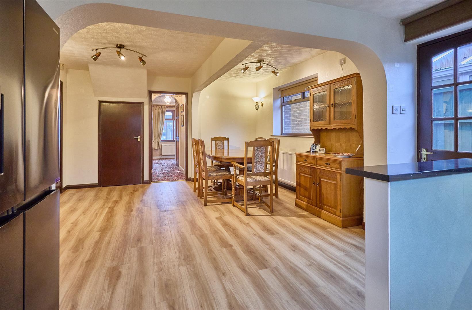 With study area, double panelled radiator, coving to ceiling, Hive thermostat for the central heating system, two matching wall lights, stairway to first floor. Attractive hardwood panel interior doors to