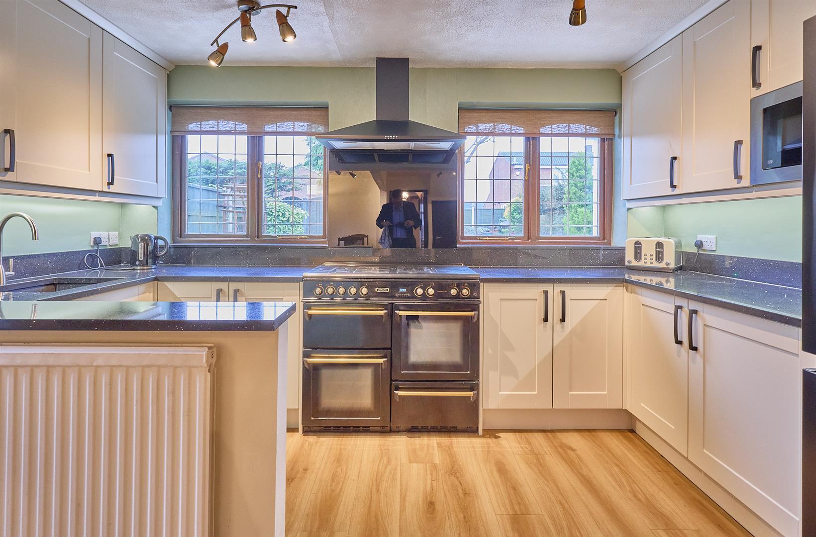 The living dining area with wood grain luxury vinyl tiles flooring, radiator, TV aerial point, useful under stairs storage cupboard, two matching wall lights, hard wood and glazed door leading to the side of the property. The refitted kitchen with a fashionable range of matt cream fitted kitchen units with soft closed doors consisting inset black single drainer sink unit mixer tap above cupboard beneath. Further matching range of floor mounted cupboard units and four drawer unit, contrasting black glitter quartz working surfaces above, matching up stands, further matching range of wall mounted cupboard units. A black leisure range cooker is included with a five ring gas hob unit, plate warmer, two ovens and grill beneath, integrated microwave, matching black chimney extractor above. Housing with a black American fridge freezer included by negotiation, luxury vinyl tile flooring. Concealed lighting over the working surfaces, radiator door to