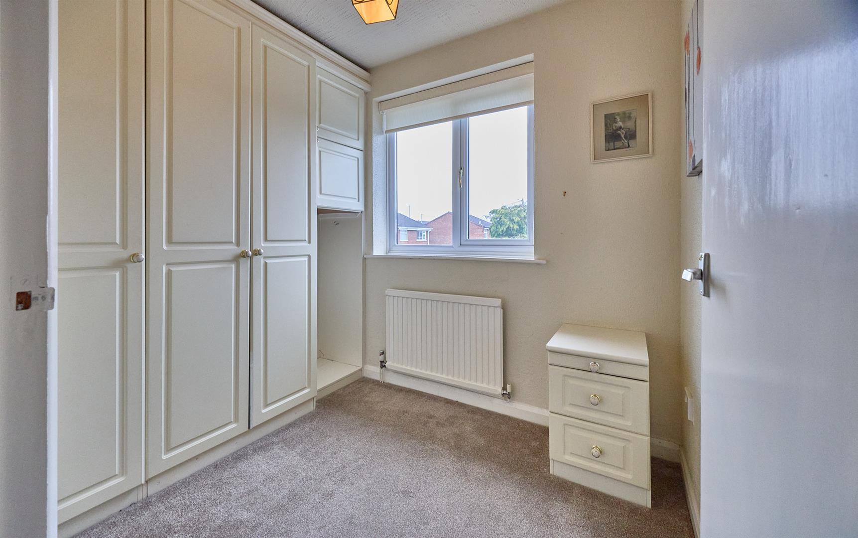 With a range of fitted bedroom furniture in cream consisting one single wardrobe unit, further wall mounted storage cupboard, radiator.