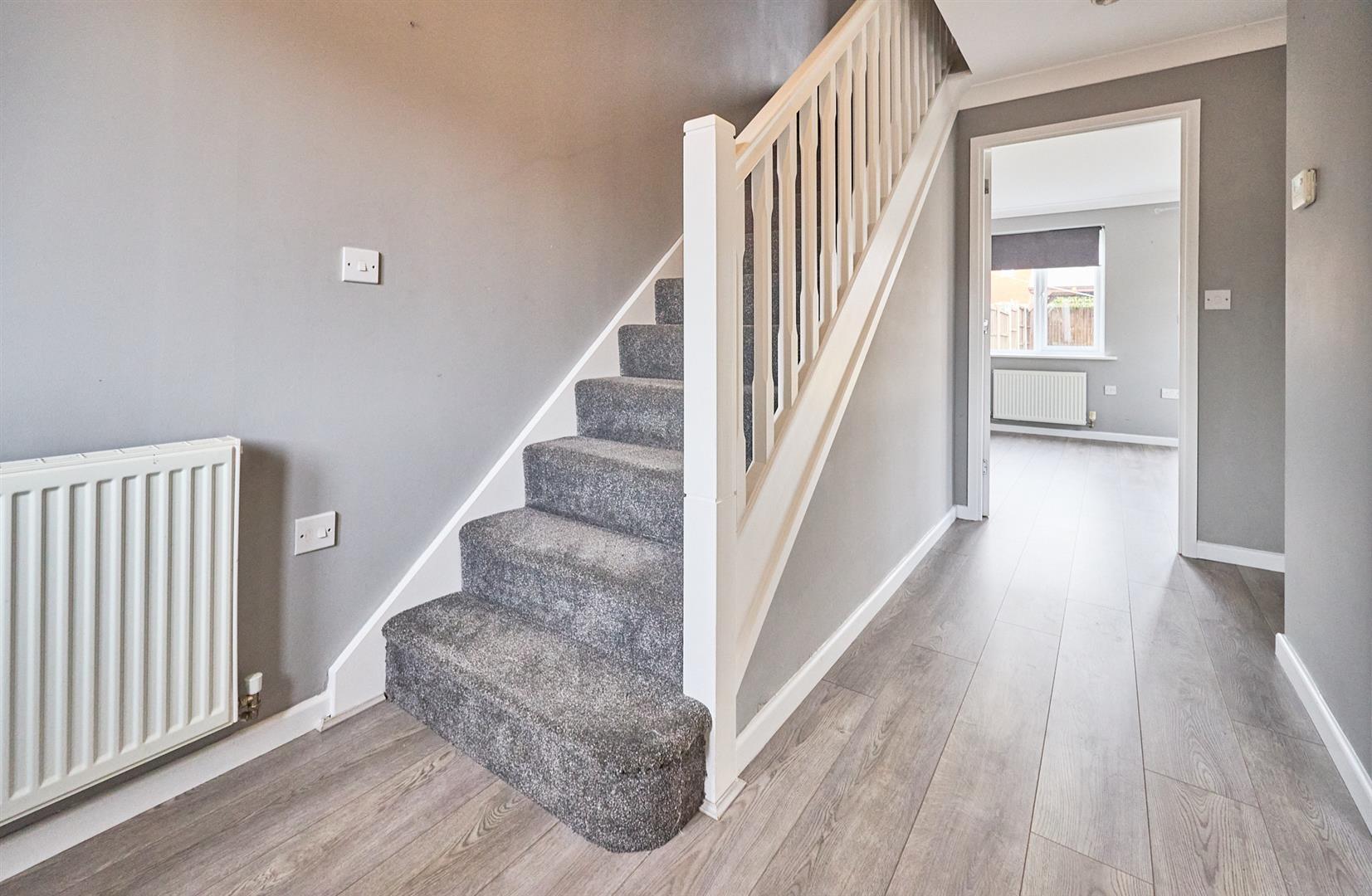 With grey oak finish laminate wood strip flooring, radiator, wall mounted consumer unit, doorbell chimes, telephone point, wired in smoke alarm, digital thermostat for the central heating system on the ground floor, coving to ceiling, stairway to first floor with white spindle balustrades, attractive white panelled interior door to