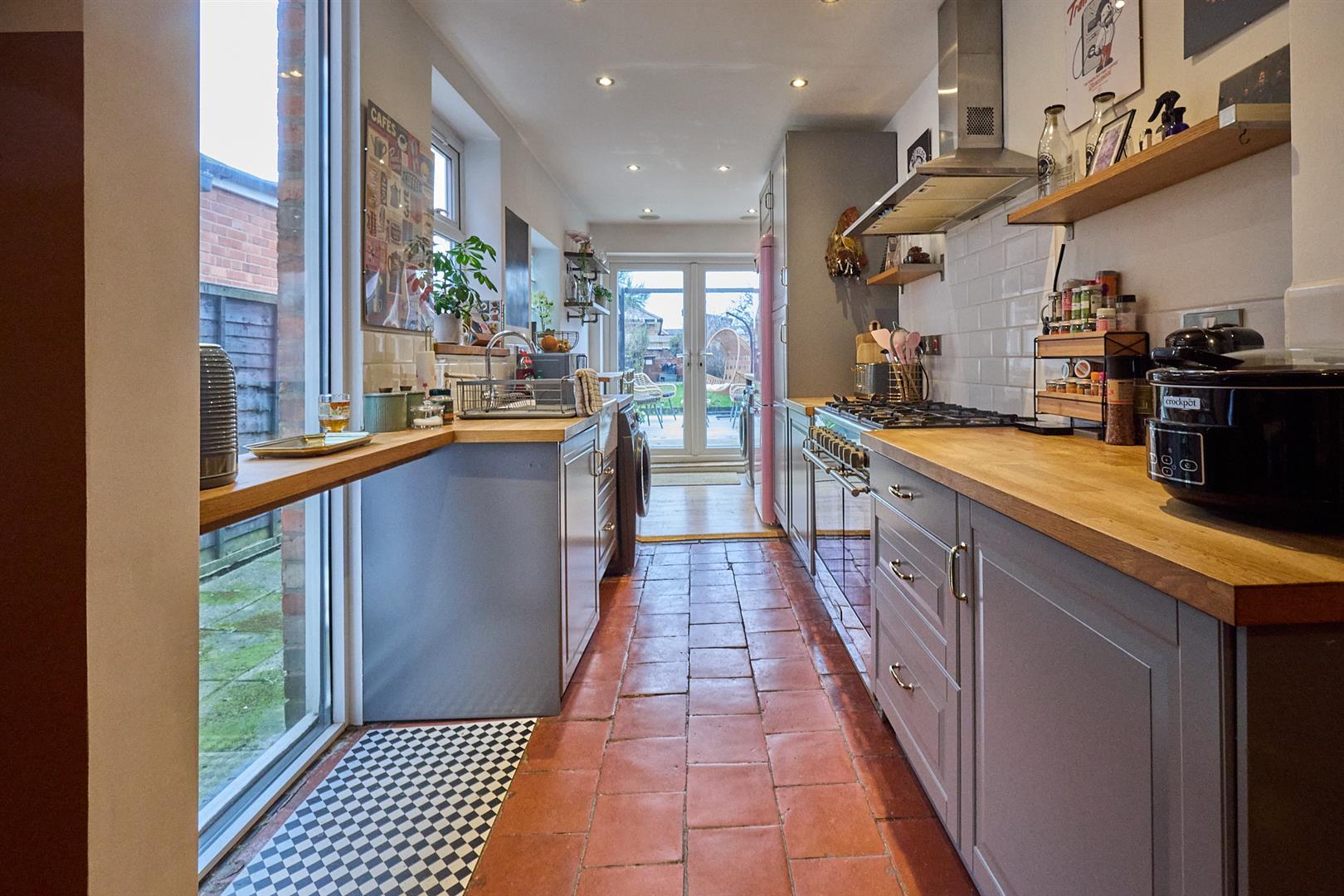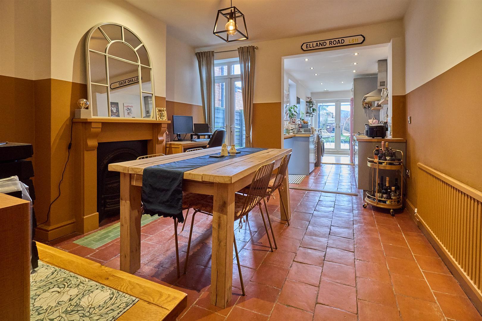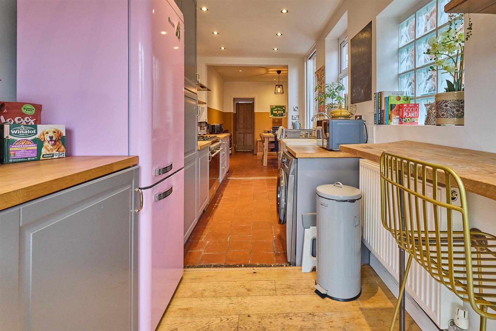 L-shaped with feature Victorian fireplace having ornamental pine surrounds, ceramic tiled hearth, black ornamental cast iron fireplace. Original quarry tiled flooring. Radiator. Inset ceiling spotlights. UPVC SUDG French doors to rear garden from the dining area. Door and stairway to first floor. Feature archway to fitted kitchen to rear with a range of gloss grey fitted kitchen units consisting inset Belfast sink unit, chrome mixer tap above and drawer beneath. Further matching range of floor mounted cupboard units and three drawer unit. Solid oak working surfaces above. Tiled splashbacks. One tall larder unit. Stainless steel chimney extractor hood. Breakfast bar. Appliance recess points. Plumbing for automatic washing machine and dishwasher. Kenwood Range cooker included with a six ring stainless steel gas hob unit, two ovens and grills with a warming drawer beneath. Stainless steel chimney extractor hood. Double panelled radiator. Original quarry tiled and oak strip flooring. Inset ceiling spotlights. Gas cooker point. Wall mounted display shelving and clothes dryer. Inset speakers in the ceiling. UPVC SUDG French doors leading from the breakfast area to the rear garden.