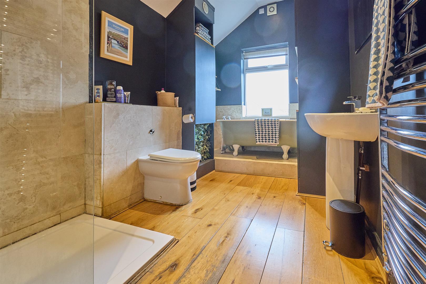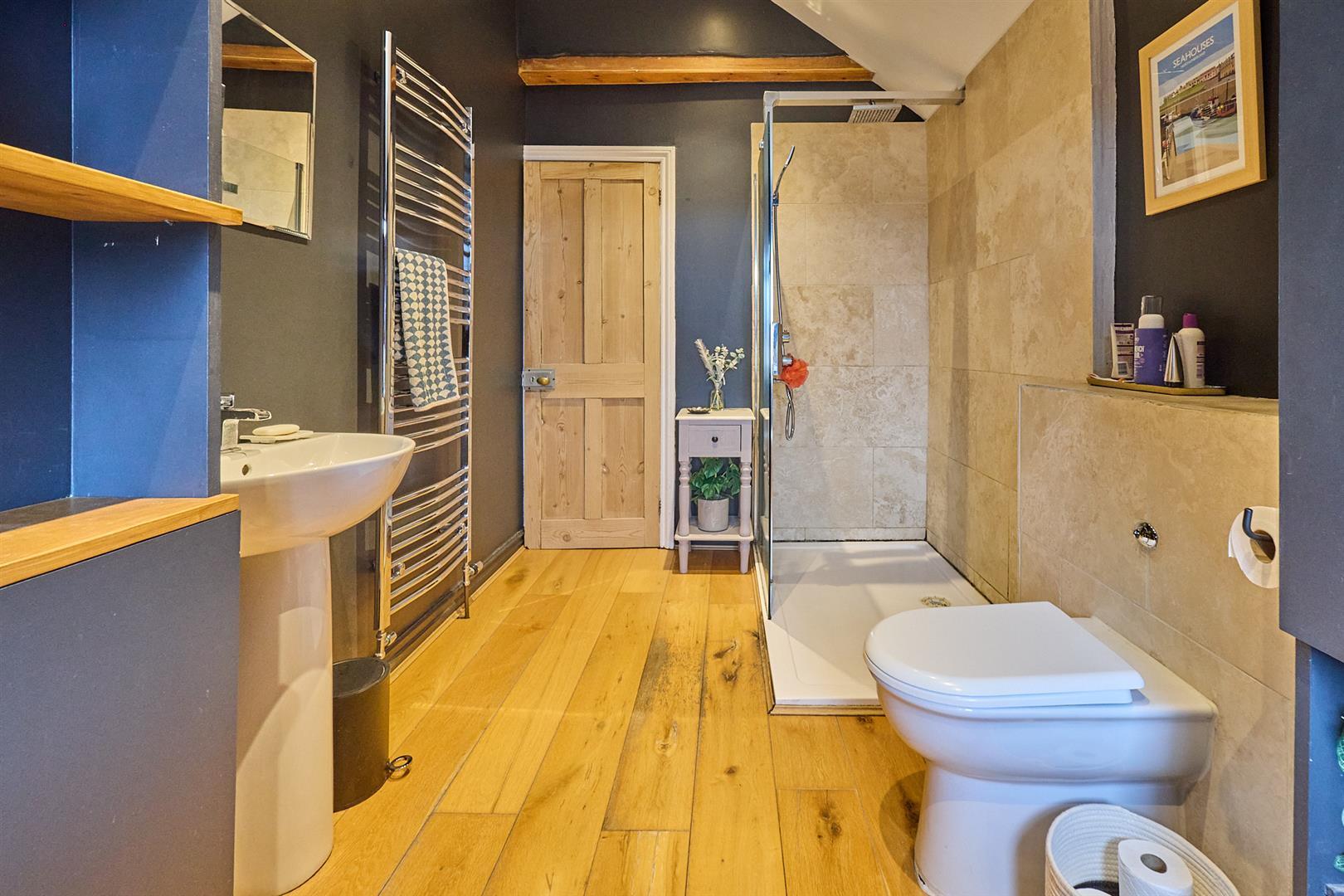 with white suite consisting freestanding roll top cast iron bath with claw feet. Tiled walk in shower with glazed shower screen, rain shower above. Pedestal wash hand basin. Low level WC. Contrasting travertine tiled surrounds. Further storage cupboards and display shelving, one concealing the gas condensing combination boiler for central heating and domestic hot water. Oak strip flooring. Chrome heated towel rail. Inset ceiling spotlights.