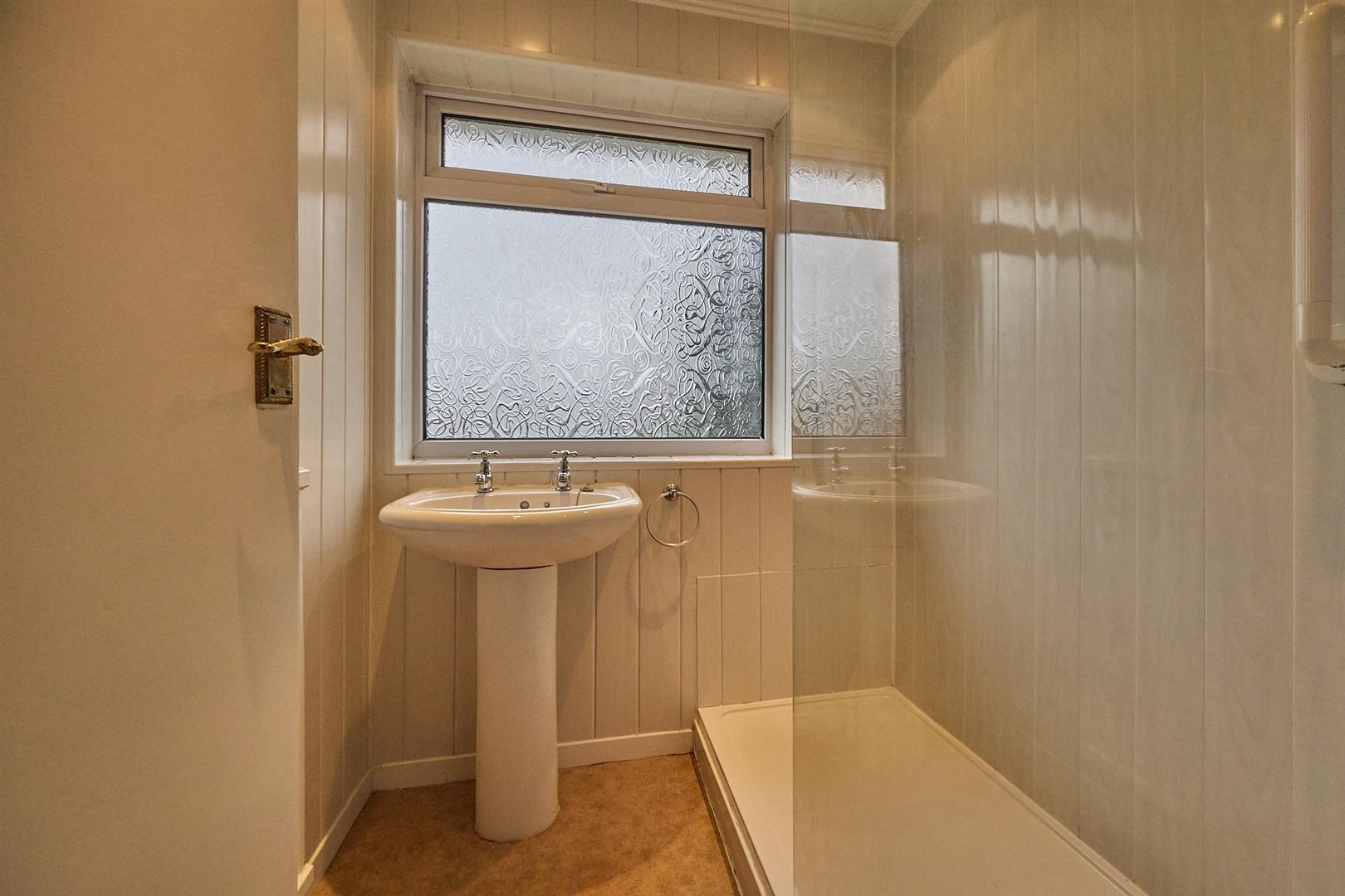With a walk in shower cubicle with glazed shower screen, wall panelling, Mira electric shower, inset ceiling spotlights, pedestal wash hand basin, double panelled radiator, door to