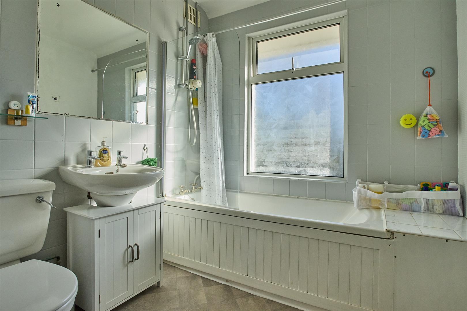 with white suite consisting panelled bath with shower unit above. Pedestal washing basin. Low level WC. Contrasting tiled surrounds. Radiator. Door to the airing cupboard housing the gas combination boiler for central heating and domestic hot water with built in programmer. Loft access with extending aluminium ladder for access, partially boarded.