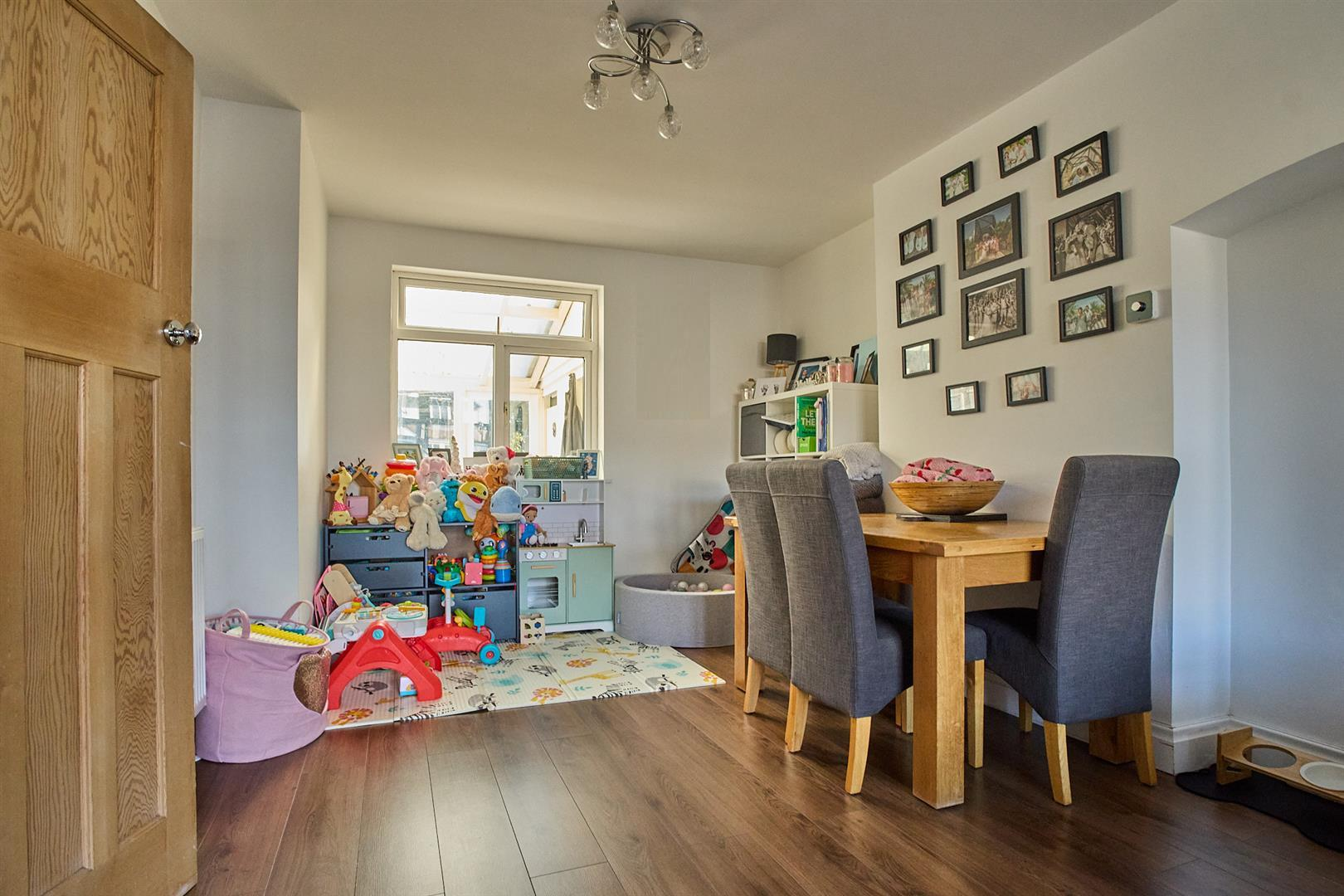 the lounge area to front with double panelled radiator, laminate flooring, two matching wall lights. TV aerial point. Rear dining area with feature fireplace having ornamental pine surrounds, raised marble hearth and backing incorporating a living flame coal effect gas fire. Arch top alcove to side. Double panelled radiator. Wall light. Wireless thermostat for central heating system.
