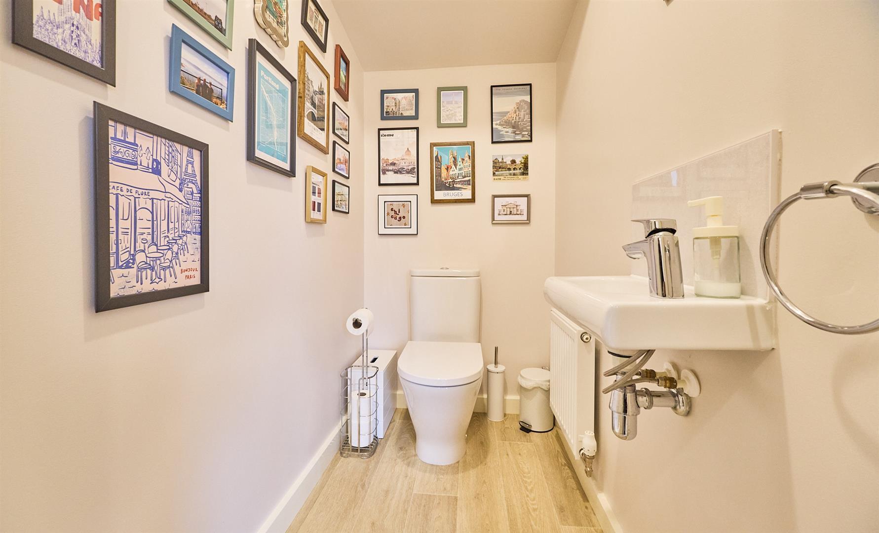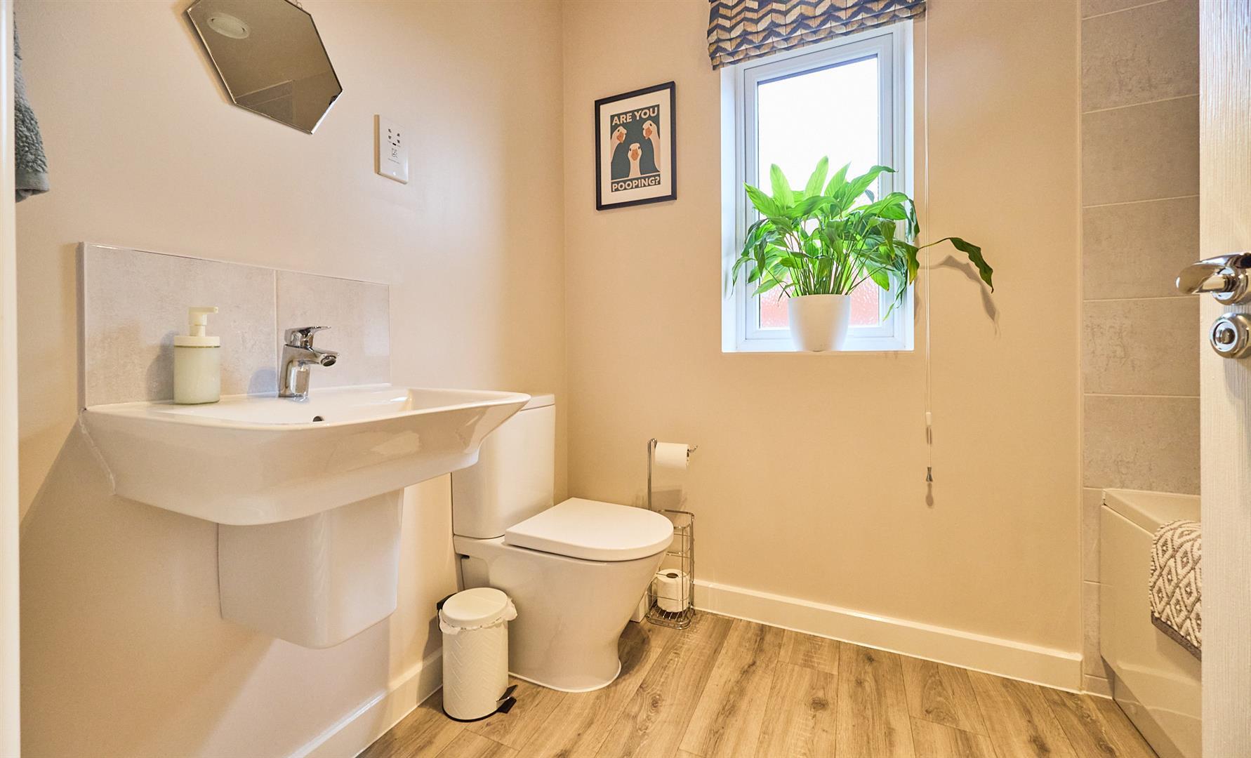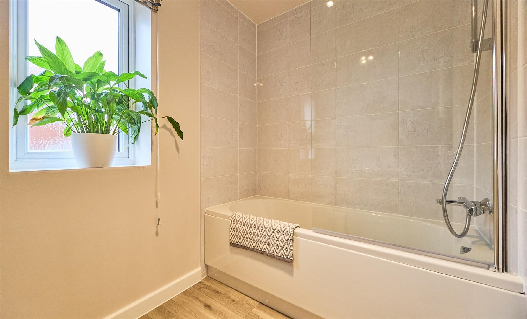 With panelled bath with mixer tap and shower attachment, glazed shower screen to side, low level WC, wall mounted sink unit with tiled splashback, vinyl flooring, heated towel rail, tiled surrounds and extractor fan.