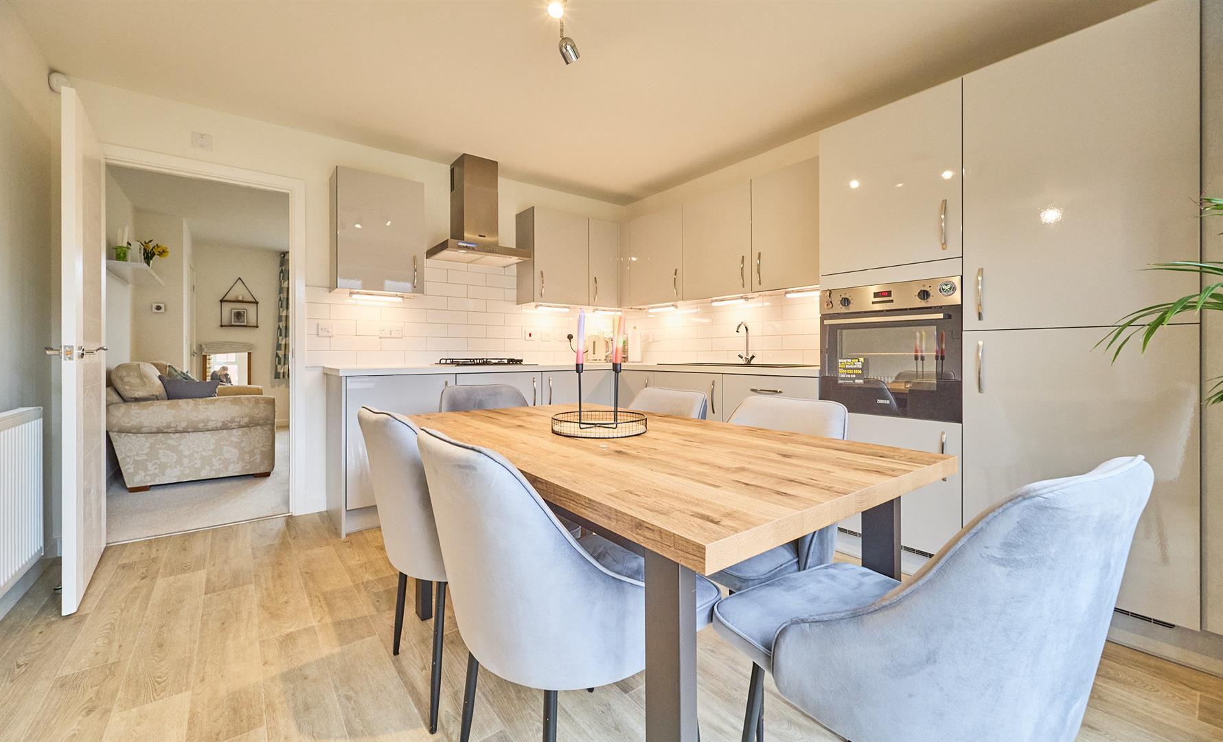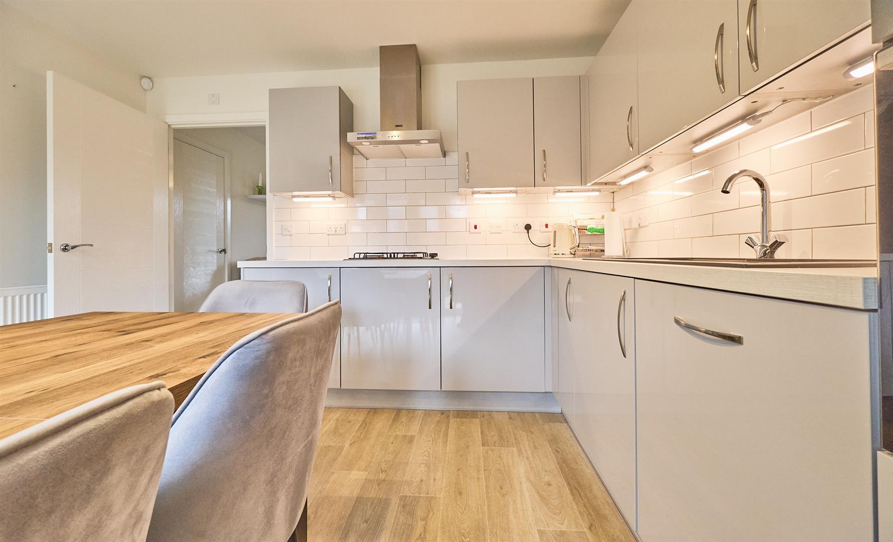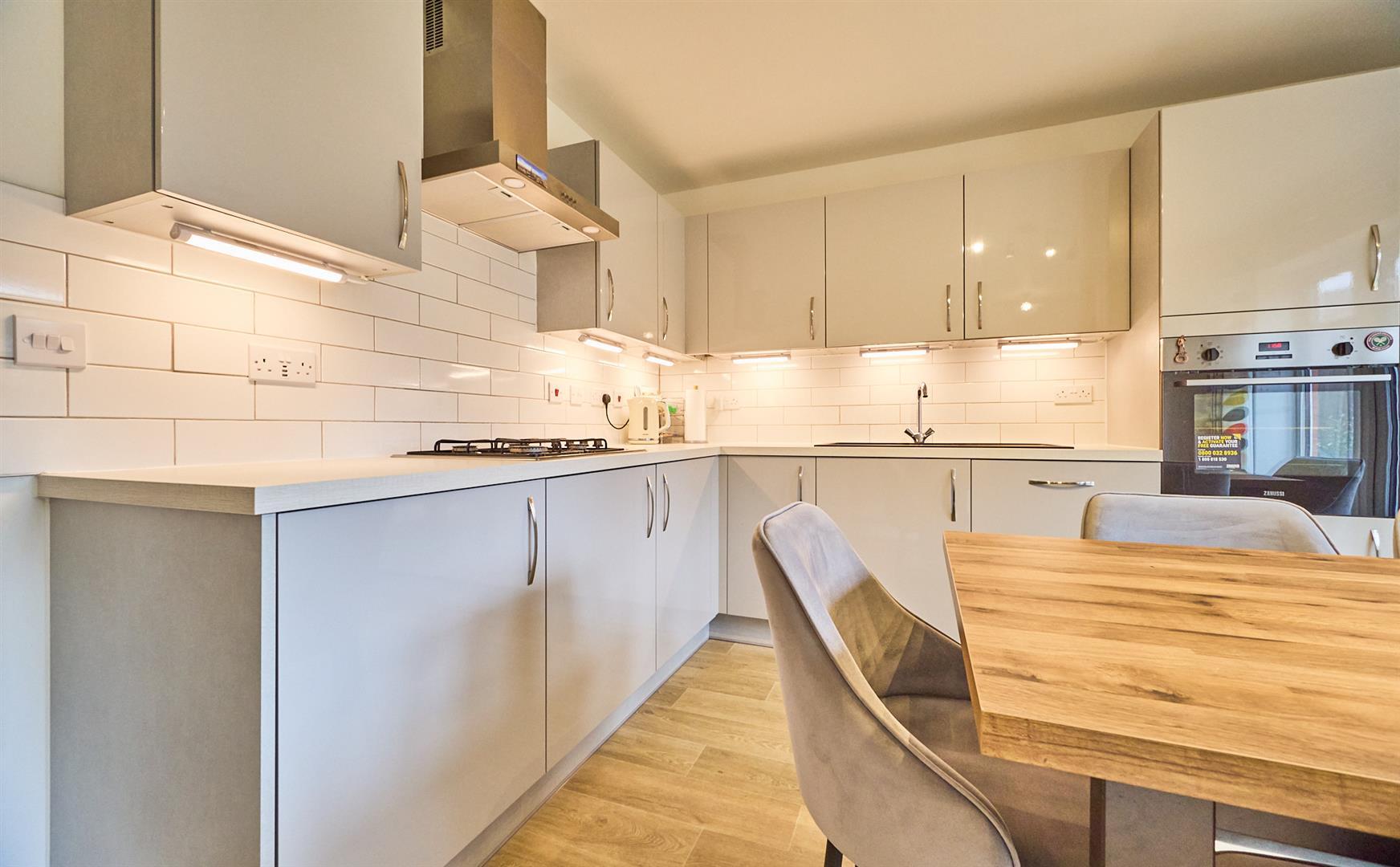 With a range of floor standing fitted kitchen units with working surface above and inset black one and a half bowl drainer sink with mixer tap. A range of integrated appliances including a Zanussi oven, gas hob with extractor above, fridge freezer and dishwasher. A further range of matching wall mounted cupboard units, white tiled splashbacks, under counter lighting, vinyl flooring, UPVC SUDG french doors to the rear garden.