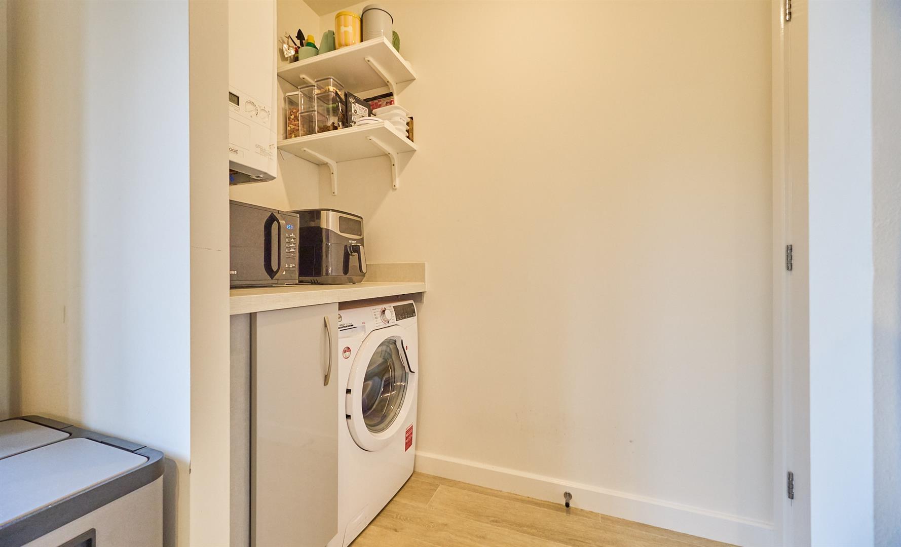 A fitted working surface with cupboard unit beneath and space for the washing machine. Wall mounted Ideal gas combination boiler for central heating and domestic hot water.