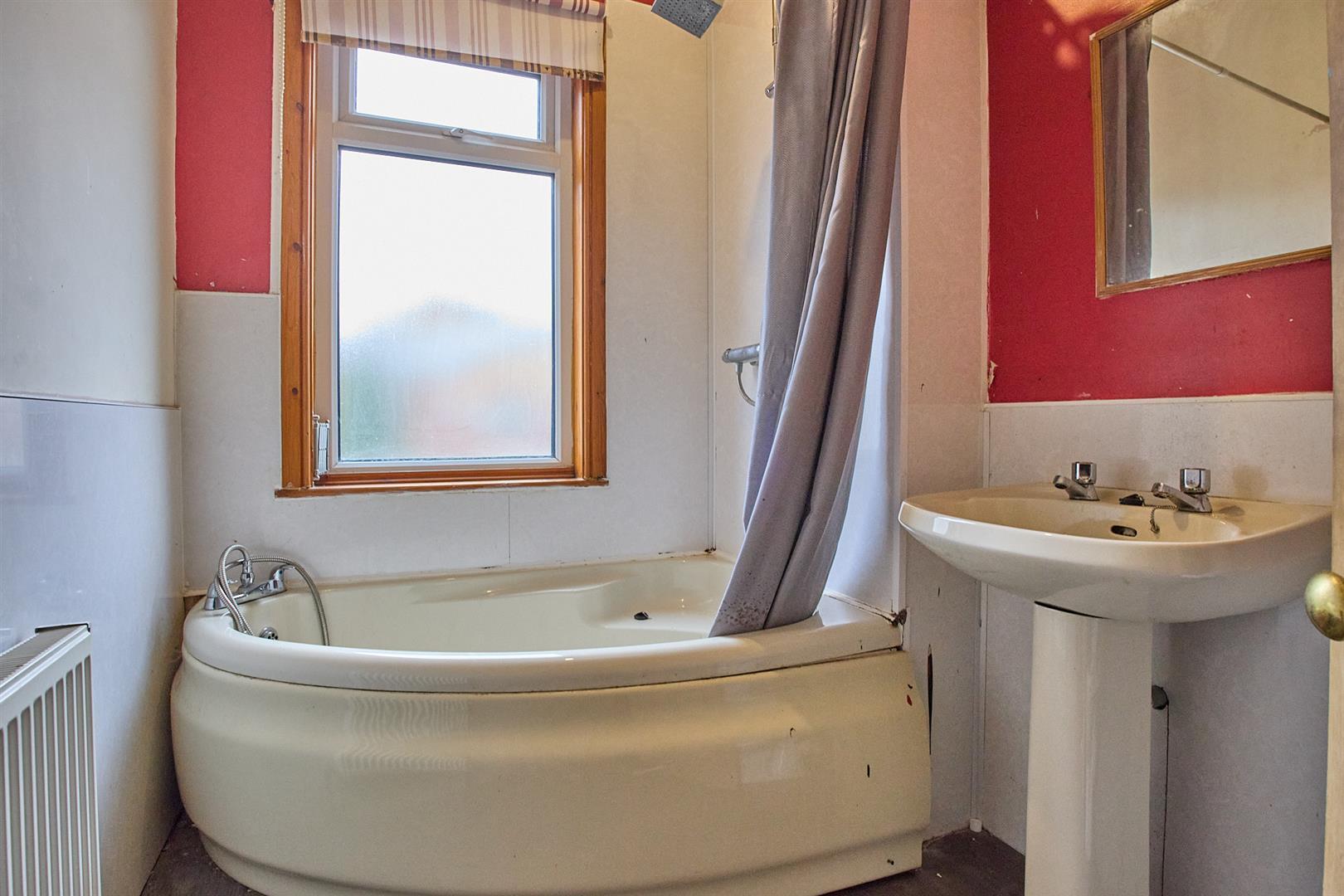 With single panelled radiator, vinyl flooring. Three piece suite consisting of low level WC, pedestal wash hand basin with chrome taps. Large corner bath with chrome taps, hand attachment and bar shower. PVC wall panelling.