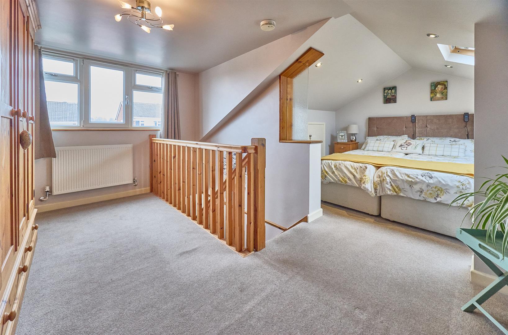 L shaped bedroom with two radiators, inset ceiling spotlights, double glazed Velux window, three doors into eaves offering boarded storage space with lighting, wired in smoke alarm.