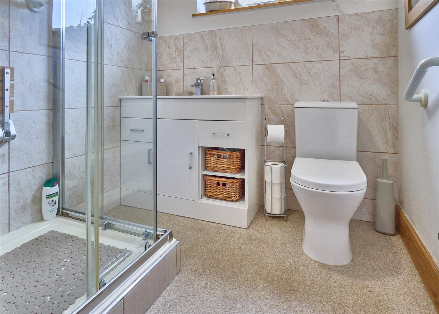 With white suite consisting of a fully tiled shower cubicle with glazed shower doors, vanity sink with gloss white cupboard and drawers beneath, low level WC, contrasting tiled surrounds, chrome heated towel rail, extractor fan.