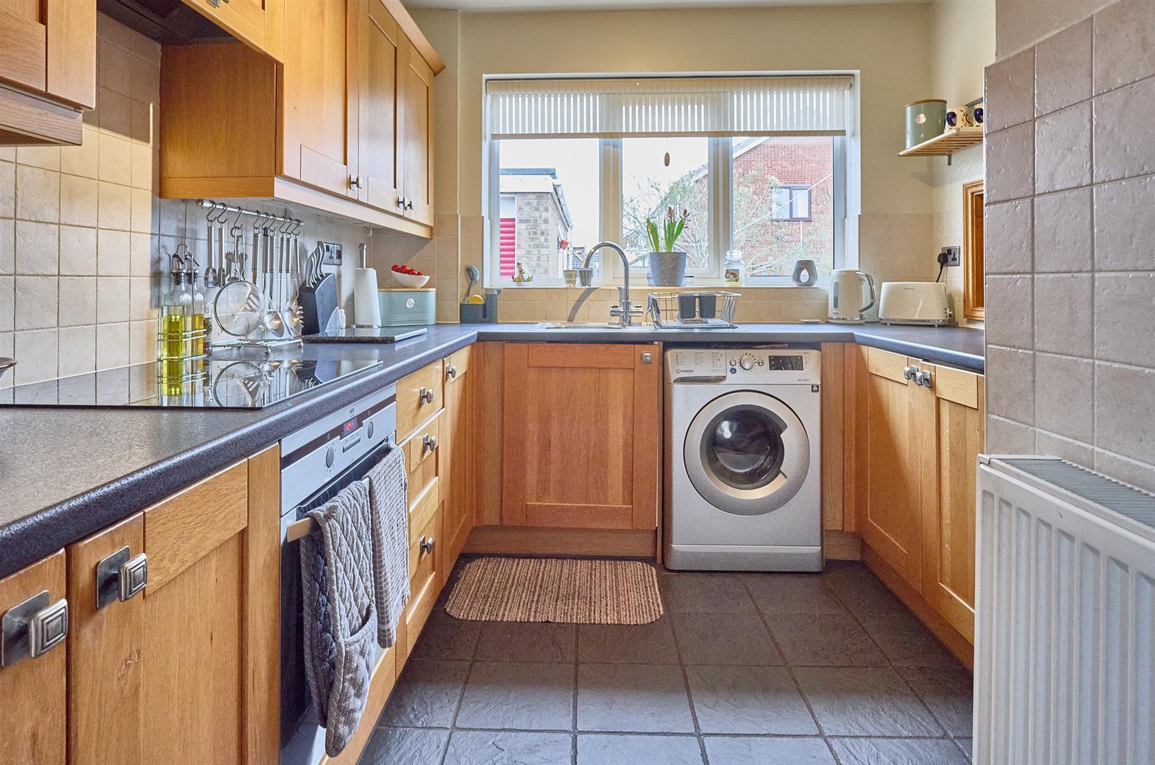 With a range of medium oak fitted kitchen units consisting inset single drainer stainless steel sink, mixer tap above cupboard beneath, further matching floor mounted cupboard units and three drawer unit, contrasting grey roll edge working surfaces above with inset four ring ceramic hob unit, integrated extractor hood, single fan assisted self cleaning oven beneath, tiled splashbacks, further matching range of wall mounted cupboard units, integrated fridge freezer. Appliance recess points, plumbing for automatic washing machine, ceramic tiled flooring, radiator, oak panel and glazed door leads to