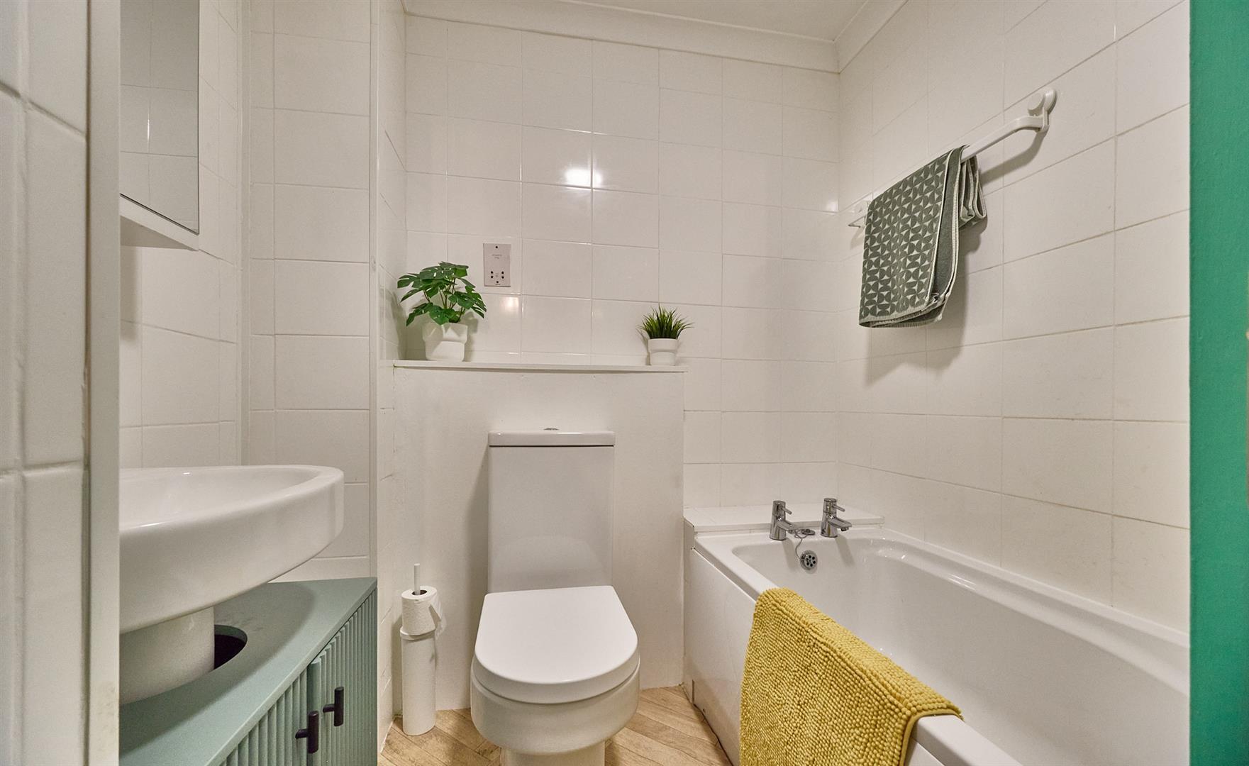 With panelled bath, mixer tap, electric shower attachment above and folding shower screen. Low level WC, pedestal wash hand basin, fully tiled surrounds, vinyl flooring and extractor fan.