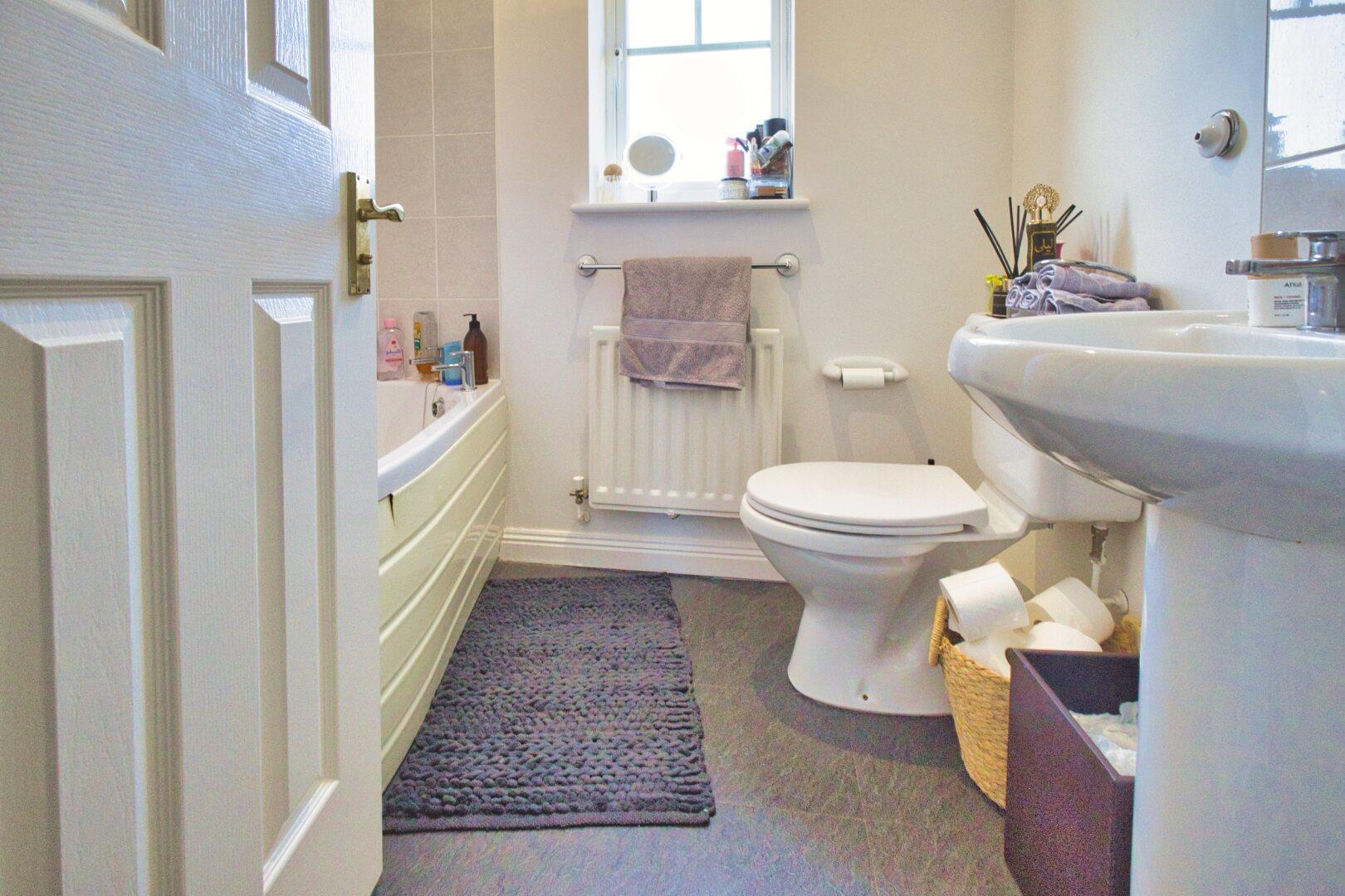 With white suite consisting panelled bath, main shower unit above, pedestal wash hand basin, low level WC. Contrasting tiled surrounds, radiator. Extractor fan, inset ceiling spotlights.